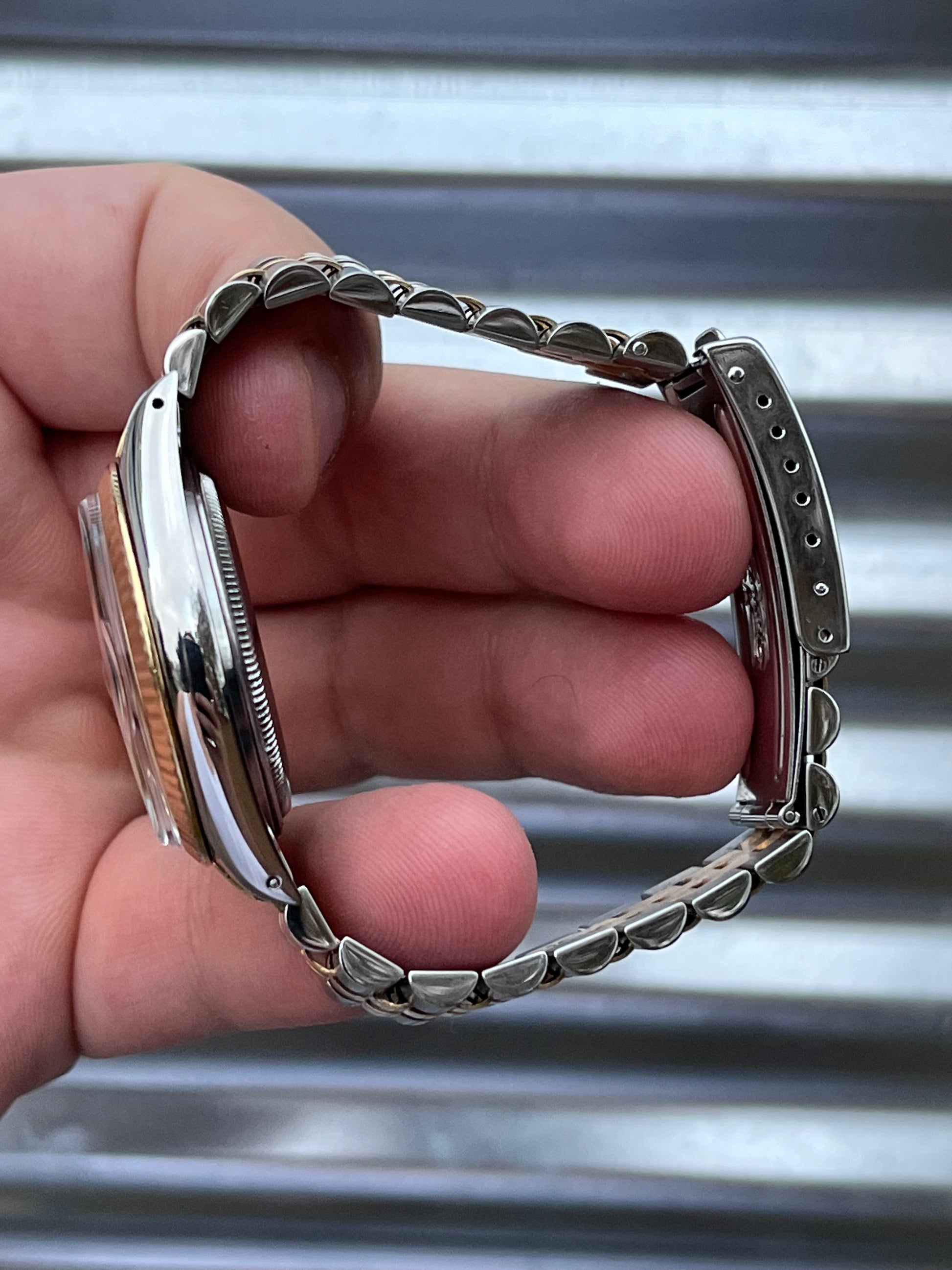 Up for sale is a freshly serviced two tone 36mm Rolex Datejust Reference 16013 with a blue dial that’s turned purple.