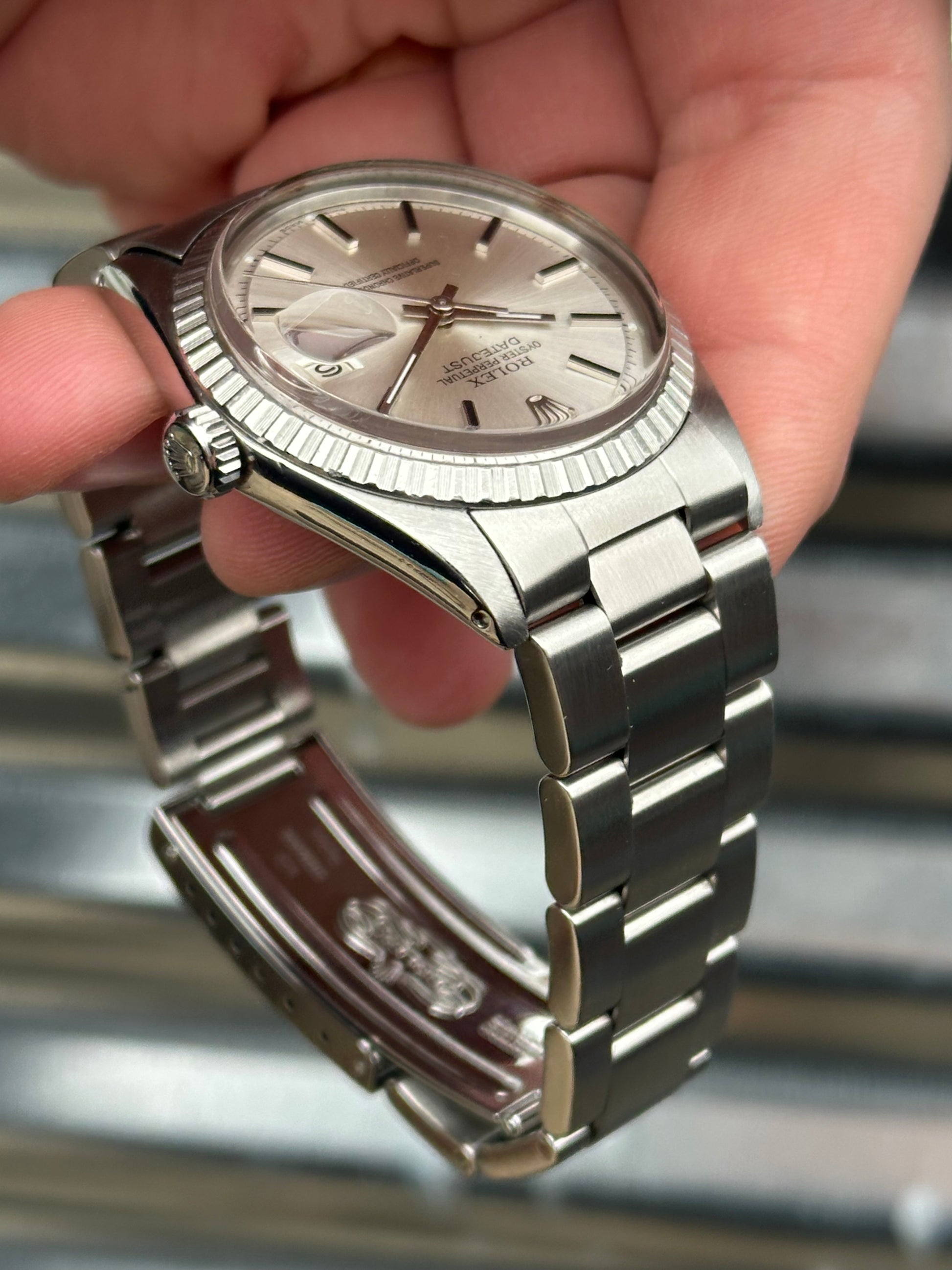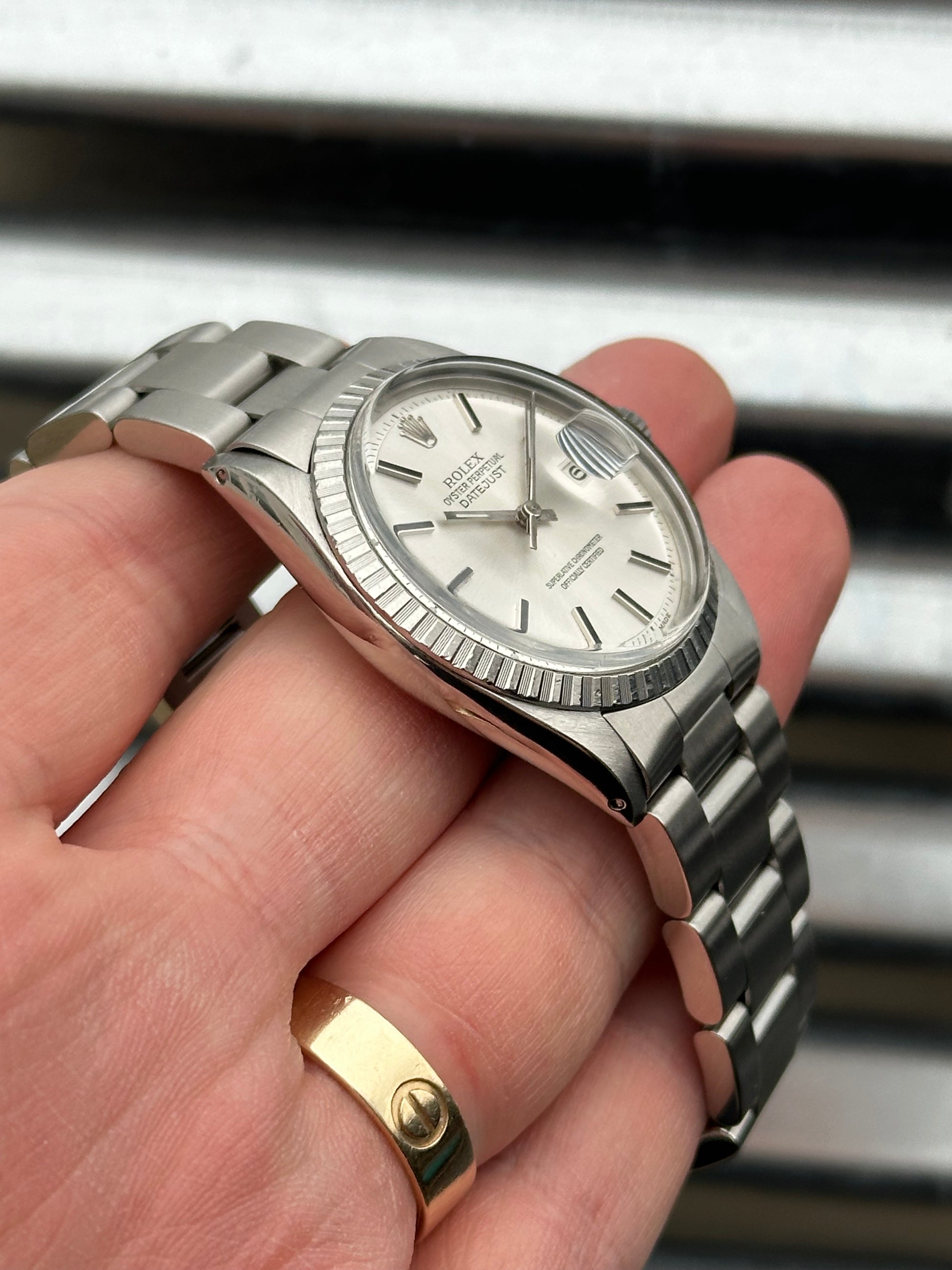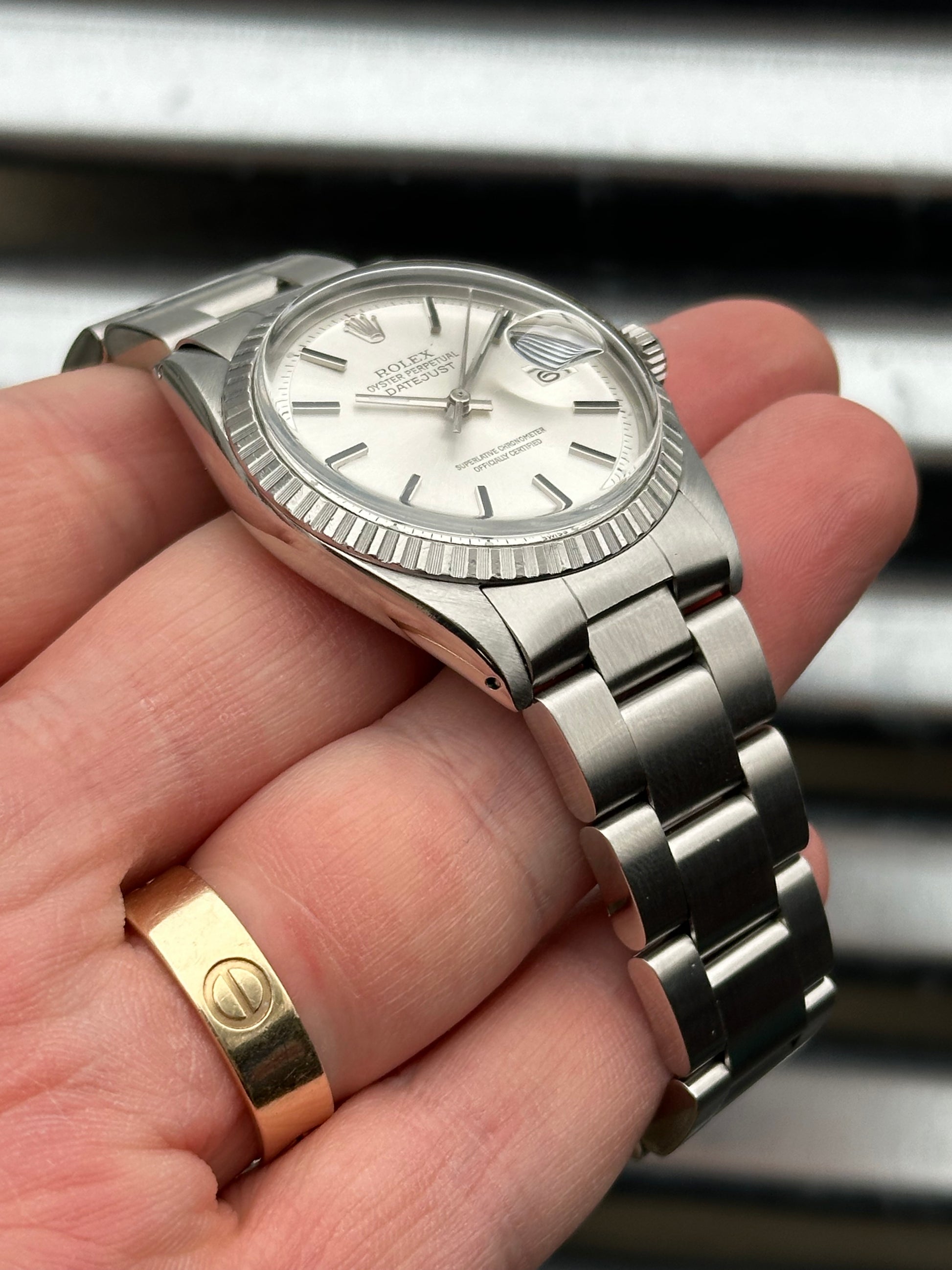 Check out this vintage beauty from 1973! Old enough to be someone’s grandfather, and yet it still functions and looks great. This is a 36mm Rolex Datejust ref. 1603 with a silver dial, engine turned bezel, and oyster bracelet.