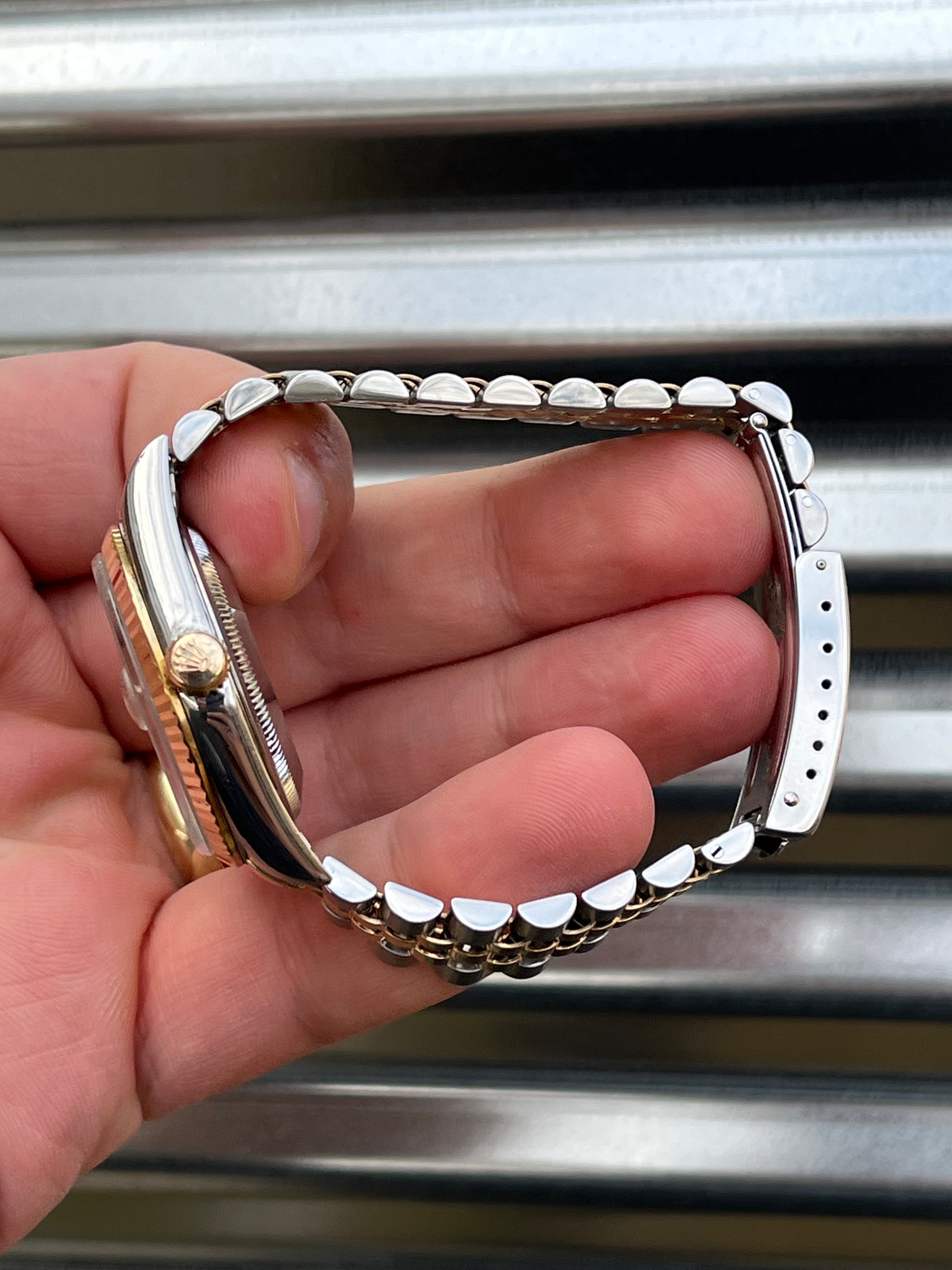 The watch is in very good excellent condition- see pics for details. The solid no-holes case remains crispy with thick lugs and sharp edges. Flat tips. The pyramid dial is absolutely gorgeous. Both the dial and hands are clean. No scratches or chips on the crystal. The bracelet is in very good shape. The finish is very clean. Minor stretch on bracelet. Thick coronet on the clasp. It comes with 20 links total which will fit about 7.25-7.5” wrist.