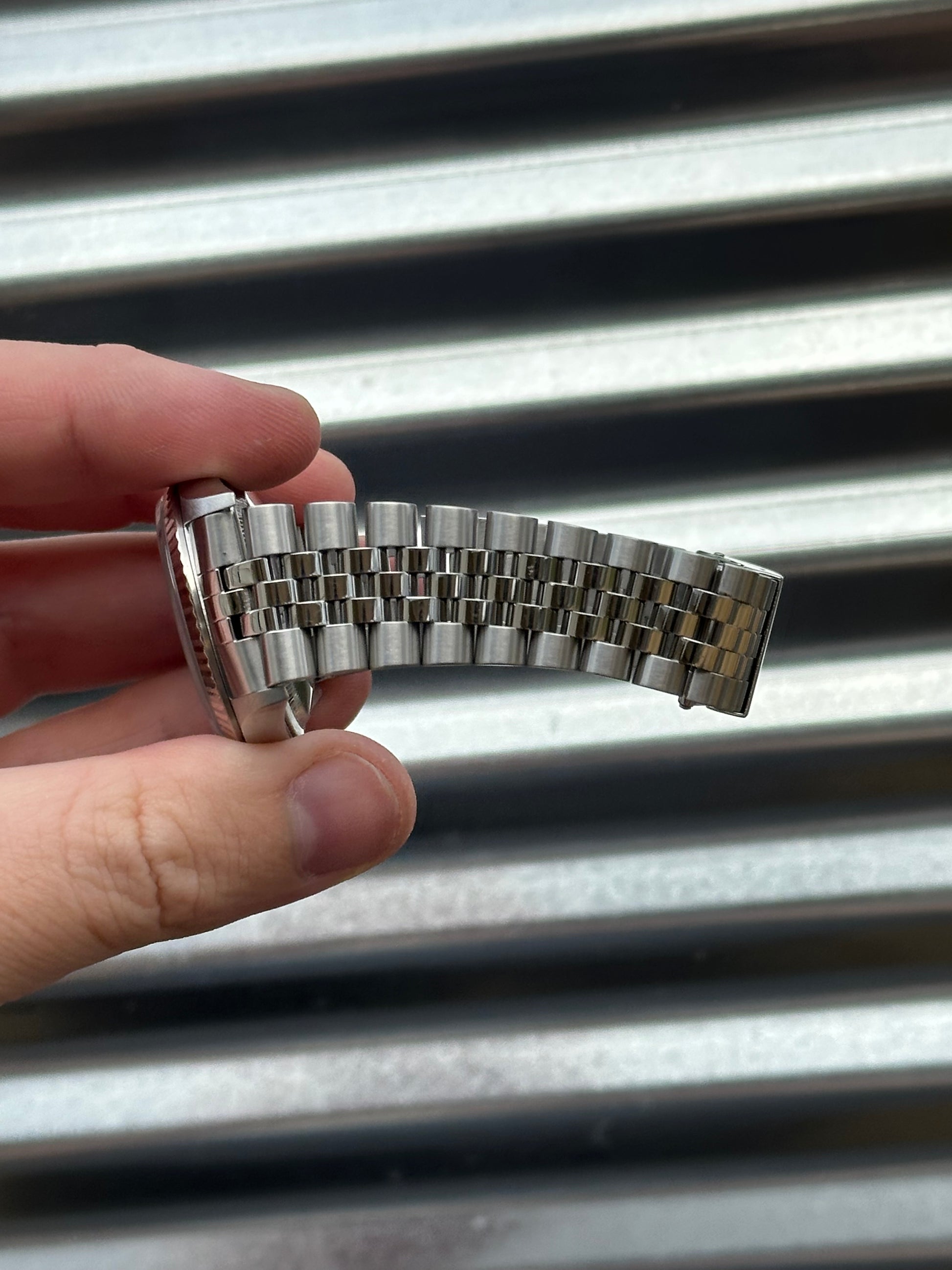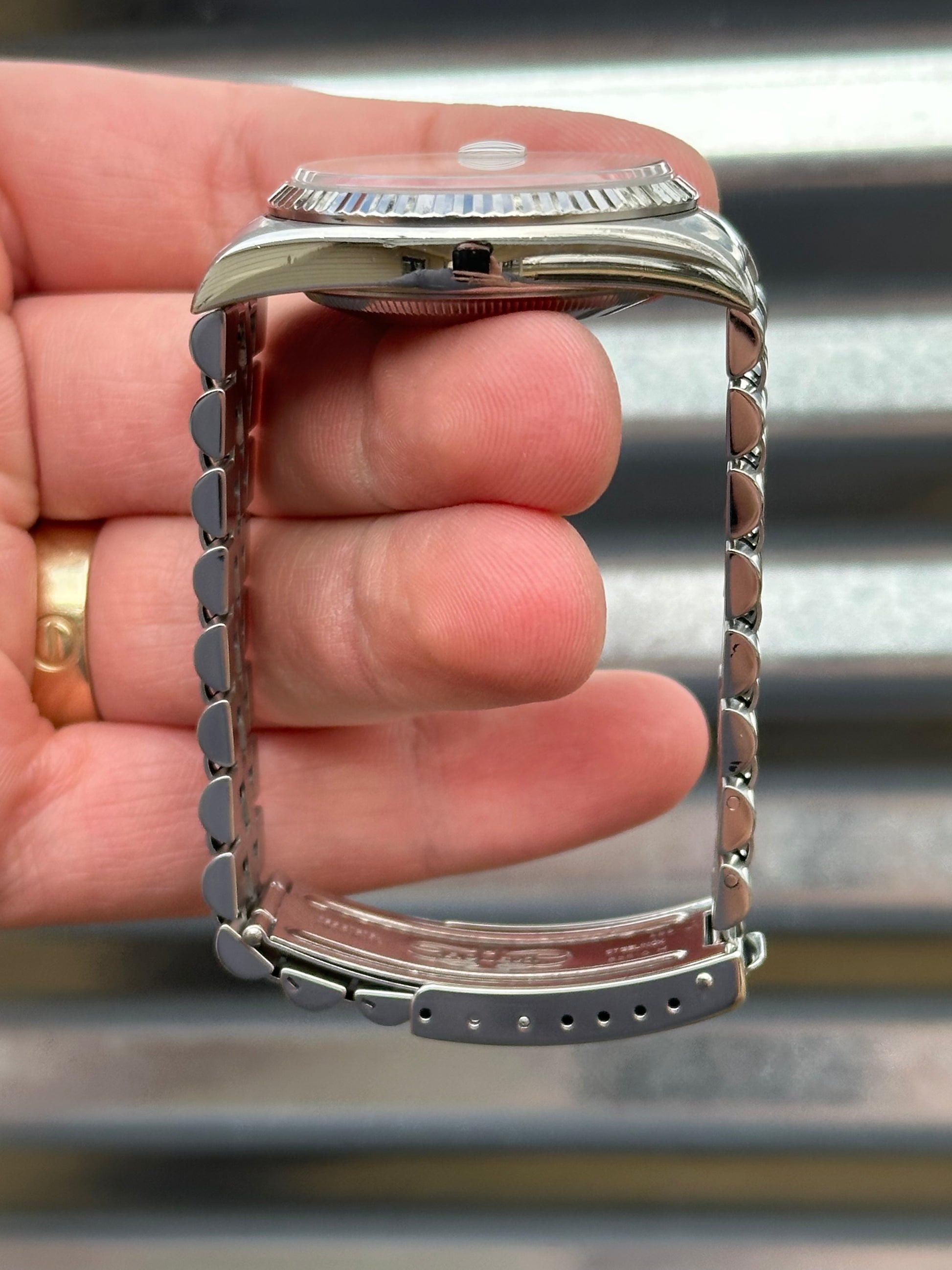 The watch is in overall excellent condition- see pics for details. It has a solid no-holes case for a clean look and the case is extra crispy with thick lugs with sharp edges. No scratches or chips on the crystal. The bracelet is in very good shape. The finish is very clean. Not too much sag on the bracelet. Thick coronet on the clasp. It comes with 20 links total which will fit about 7.25-7.5” wrist. You can’t go wrong with a salmon dial Datejust.