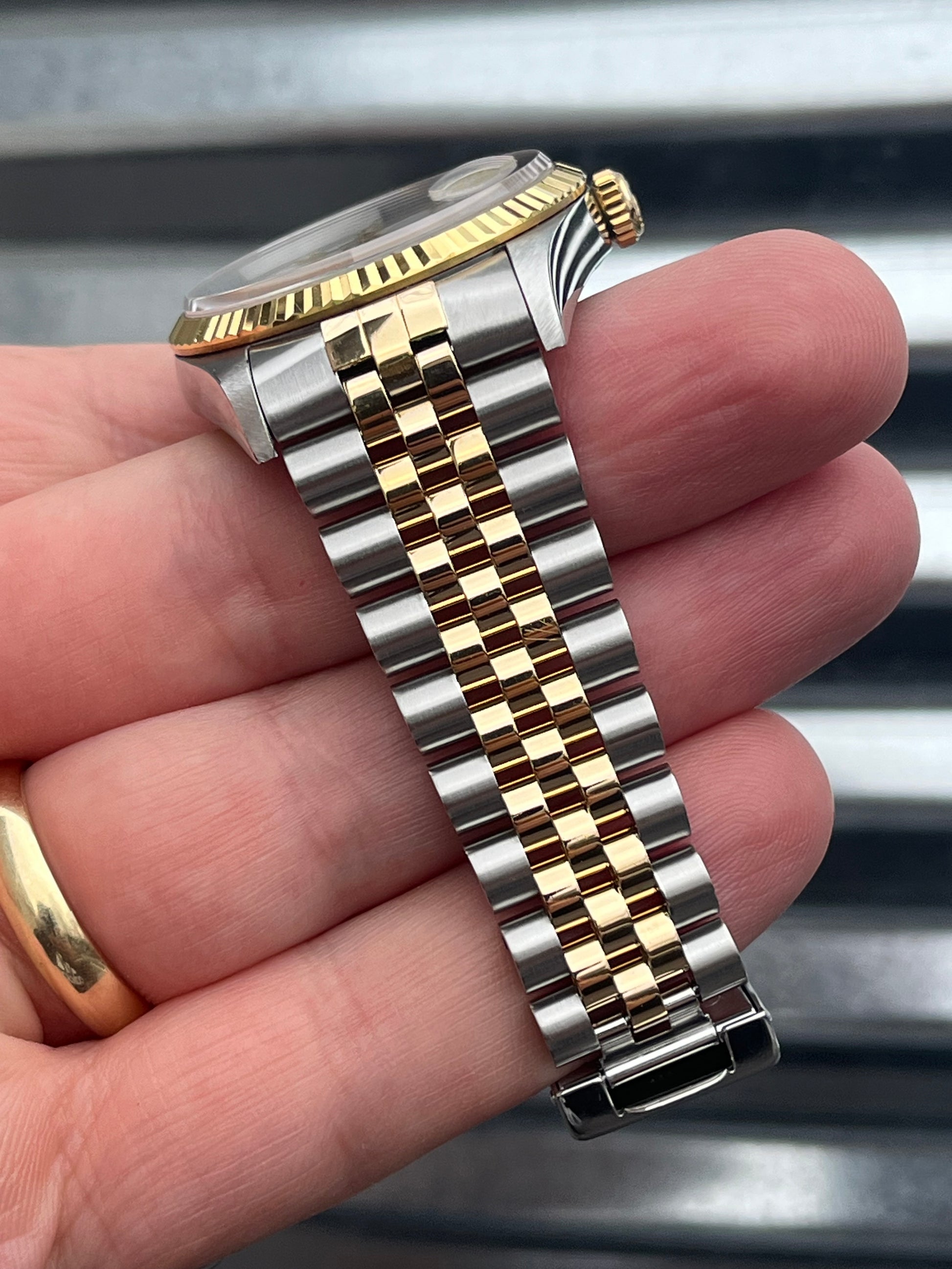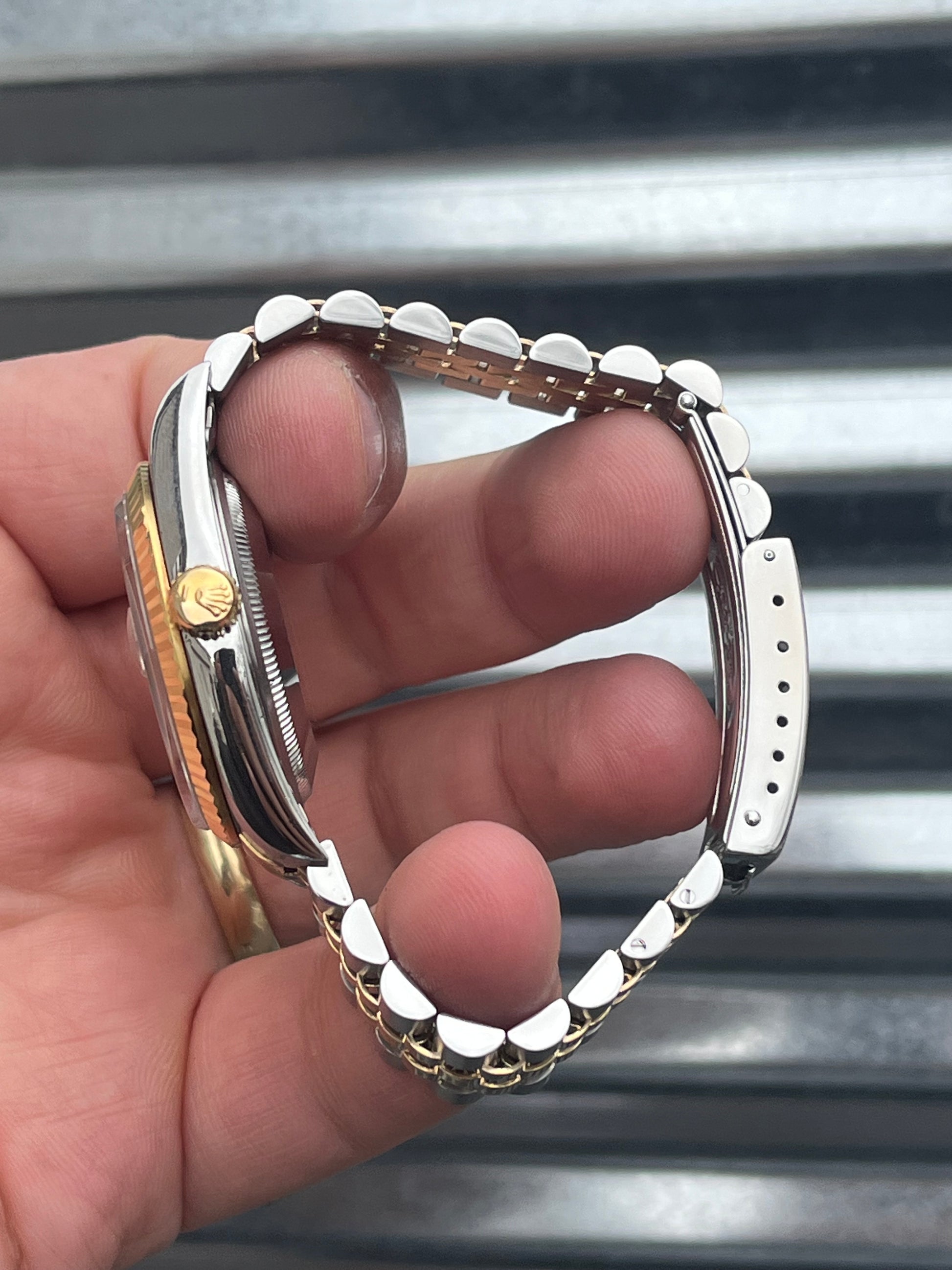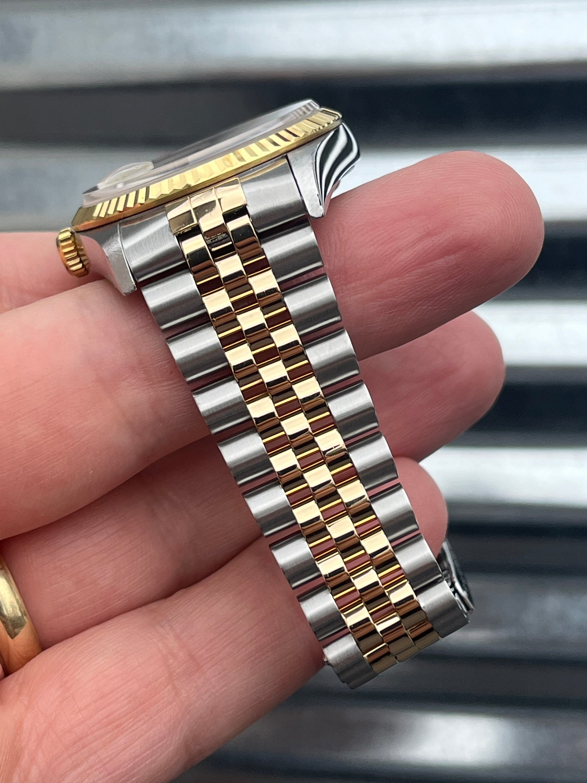 The watch is in overall excellent pre-owned condition especially for the age- see pics for details. The case is super sharp, with nice sharp edges and thick lugs. The high polish surface on the side of the case is nice and clean. The sapphire crystal is free of chips. The 18k yellow gold fluted bezel is well defined. Thick coronet on the clasp. Tight bracelet. Overall this is a nice set that’s suitable for a collector as well as someone looking for a clean daily!