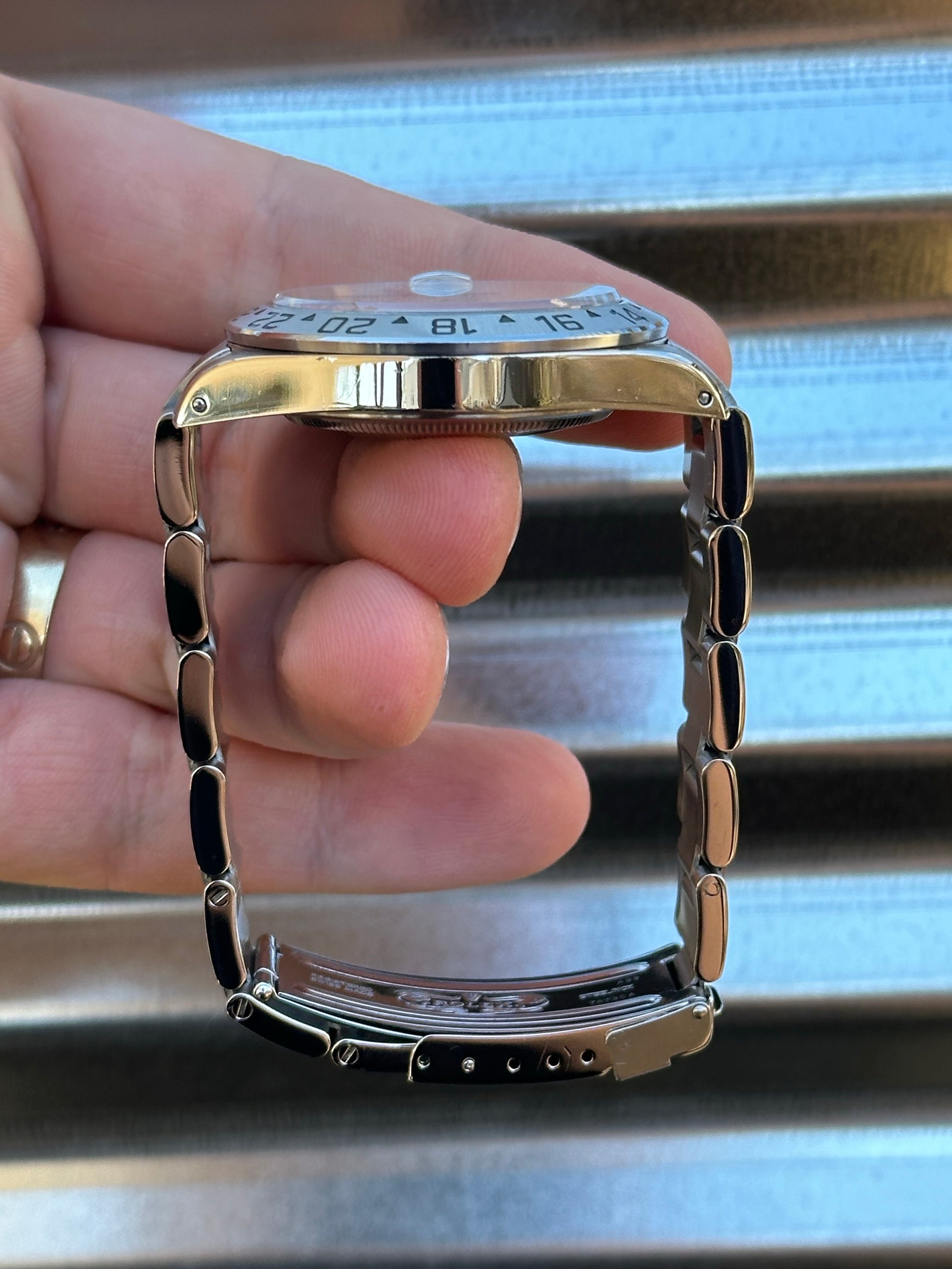 The watch is in overall excellent pre-owned condition - see pics for details. The 40mm holes case is nice and sharp. Chamfers still present. No dings or dents. Clean lugs and high polish sides. Bracelet links are clean. Free of scratches or dings. The clasp is in good shape. Thick coronet. Tight bracelet. Overall stunning watch.