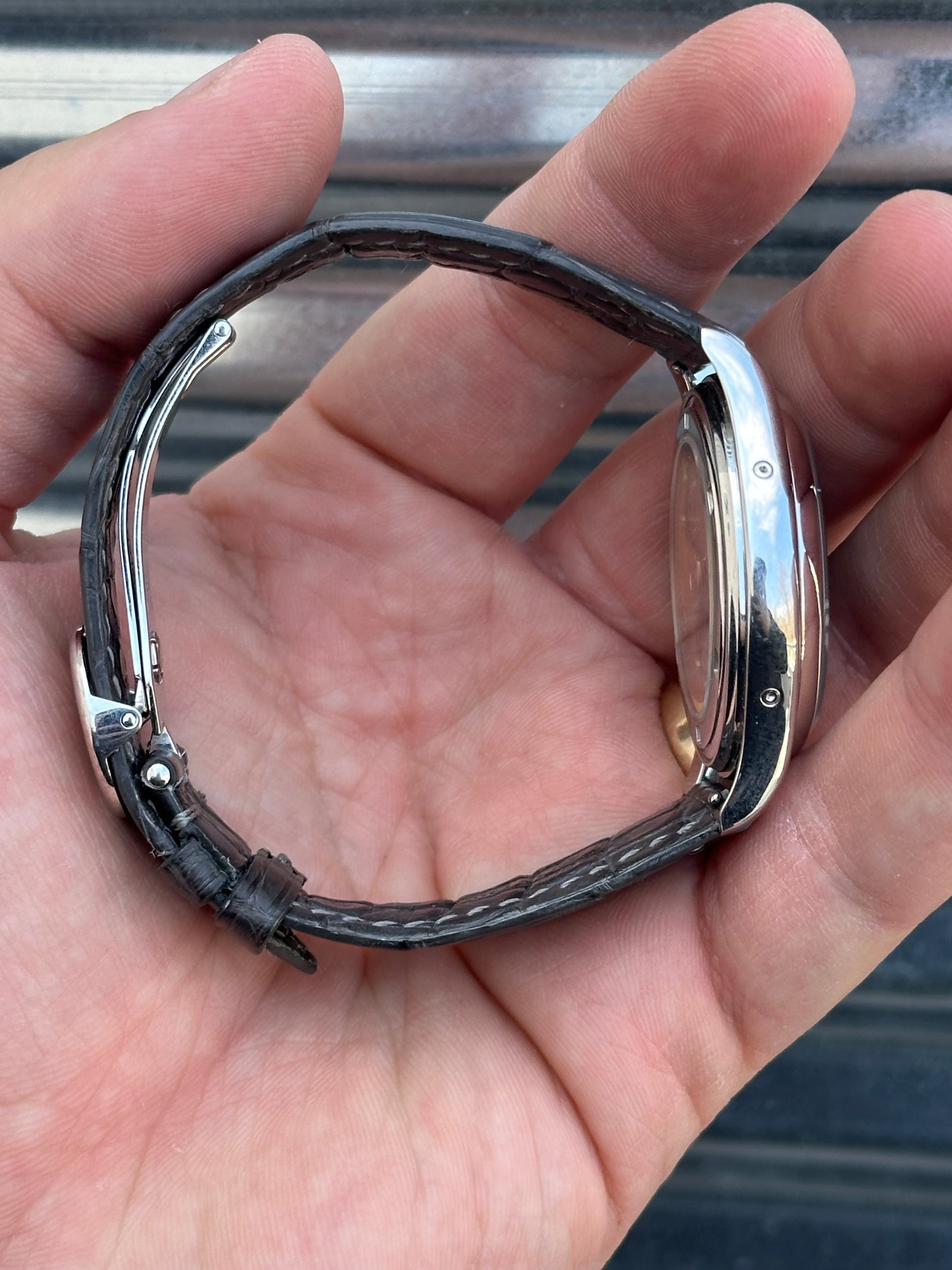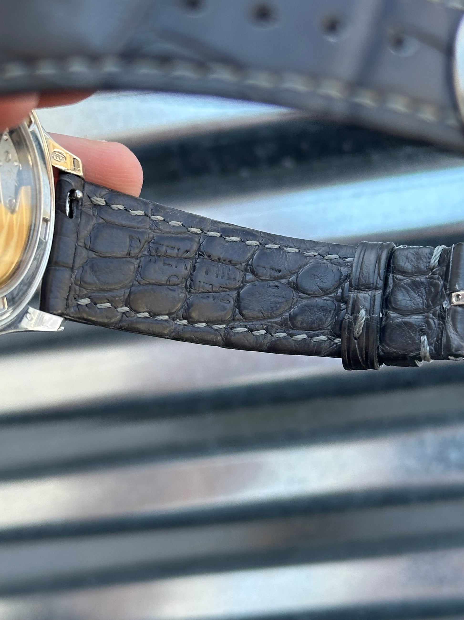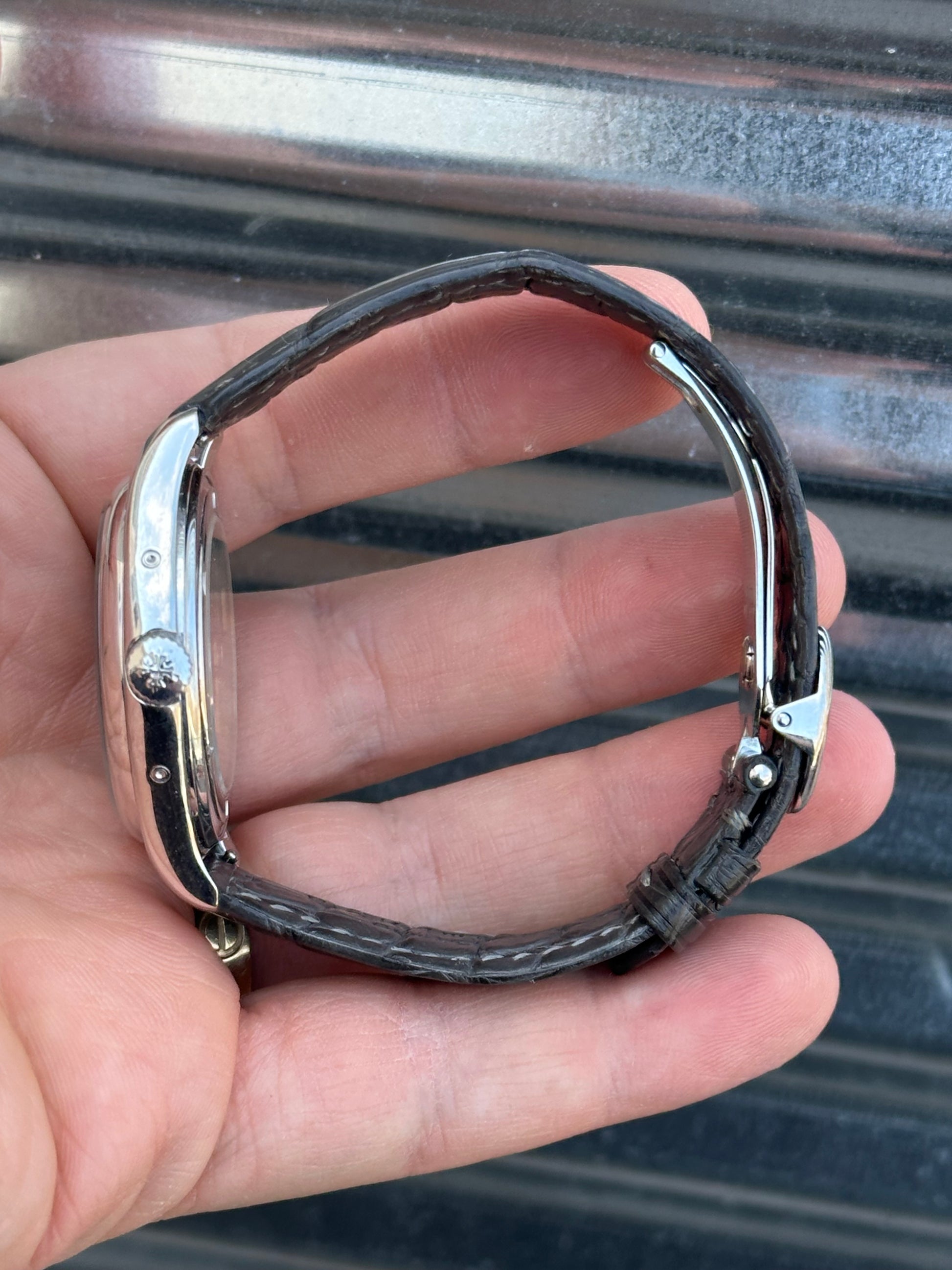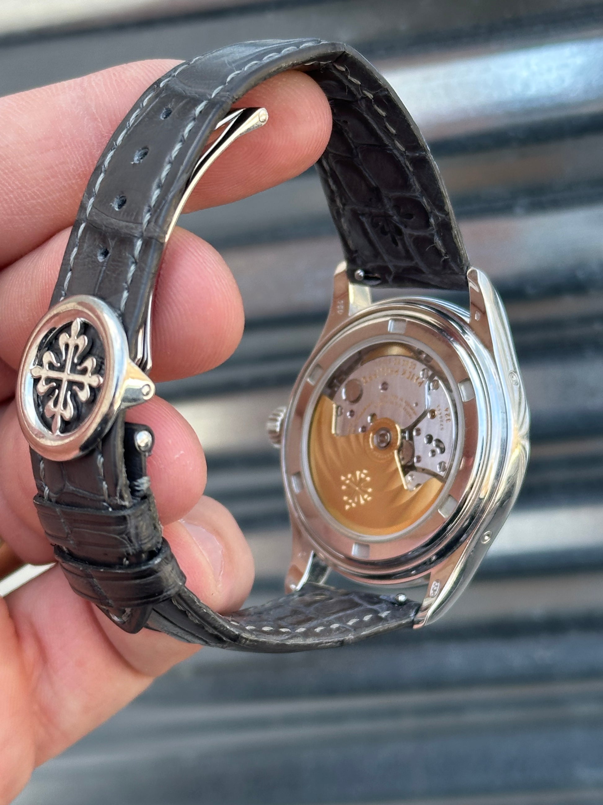 This is powered by PP Calibre 324 automatic winding movement. It comes fitted with a PP grey alligator strap which matches the grey dial. The strap will fit a larger wrist. It has the original PP white gold deployant clasp.