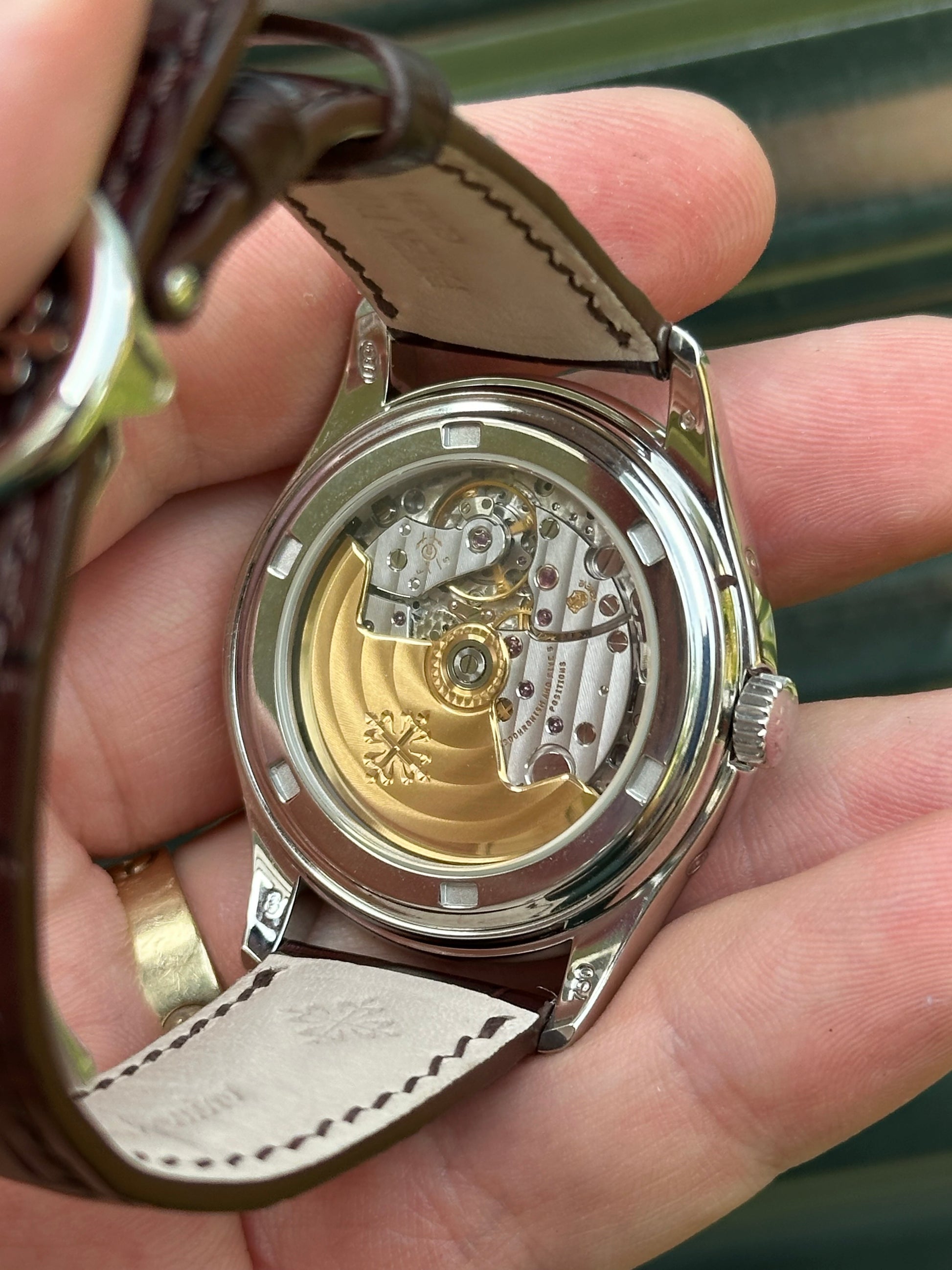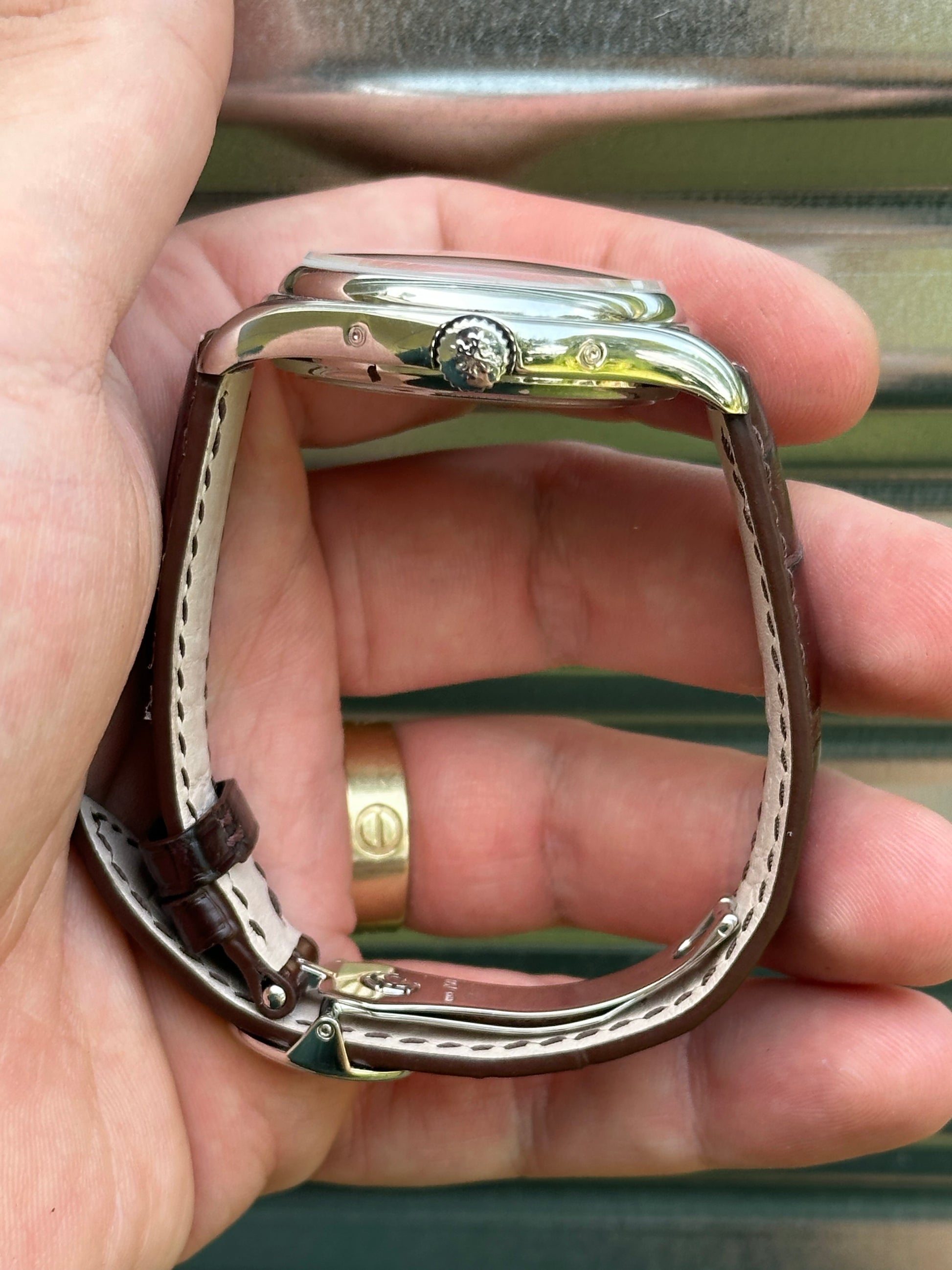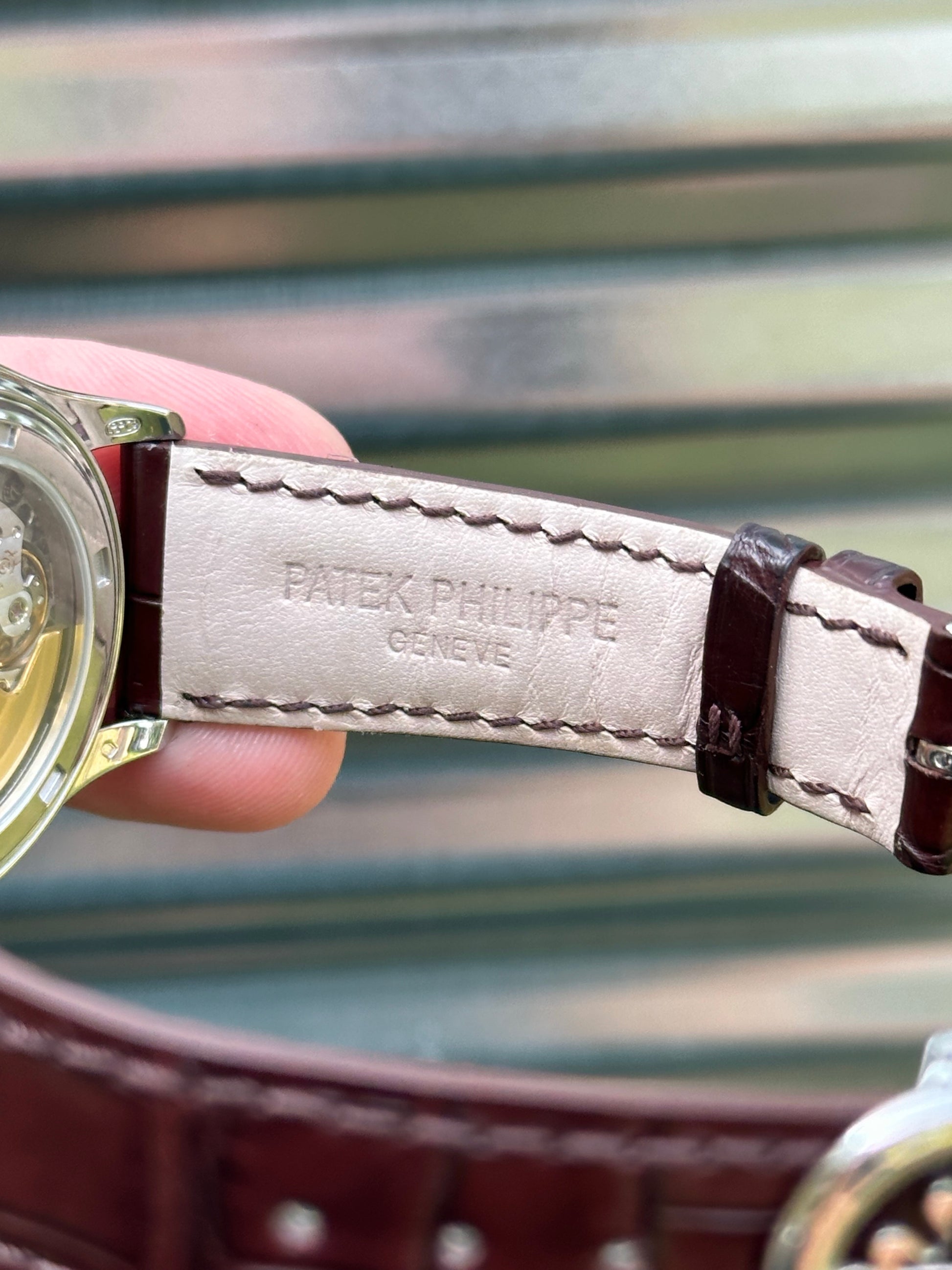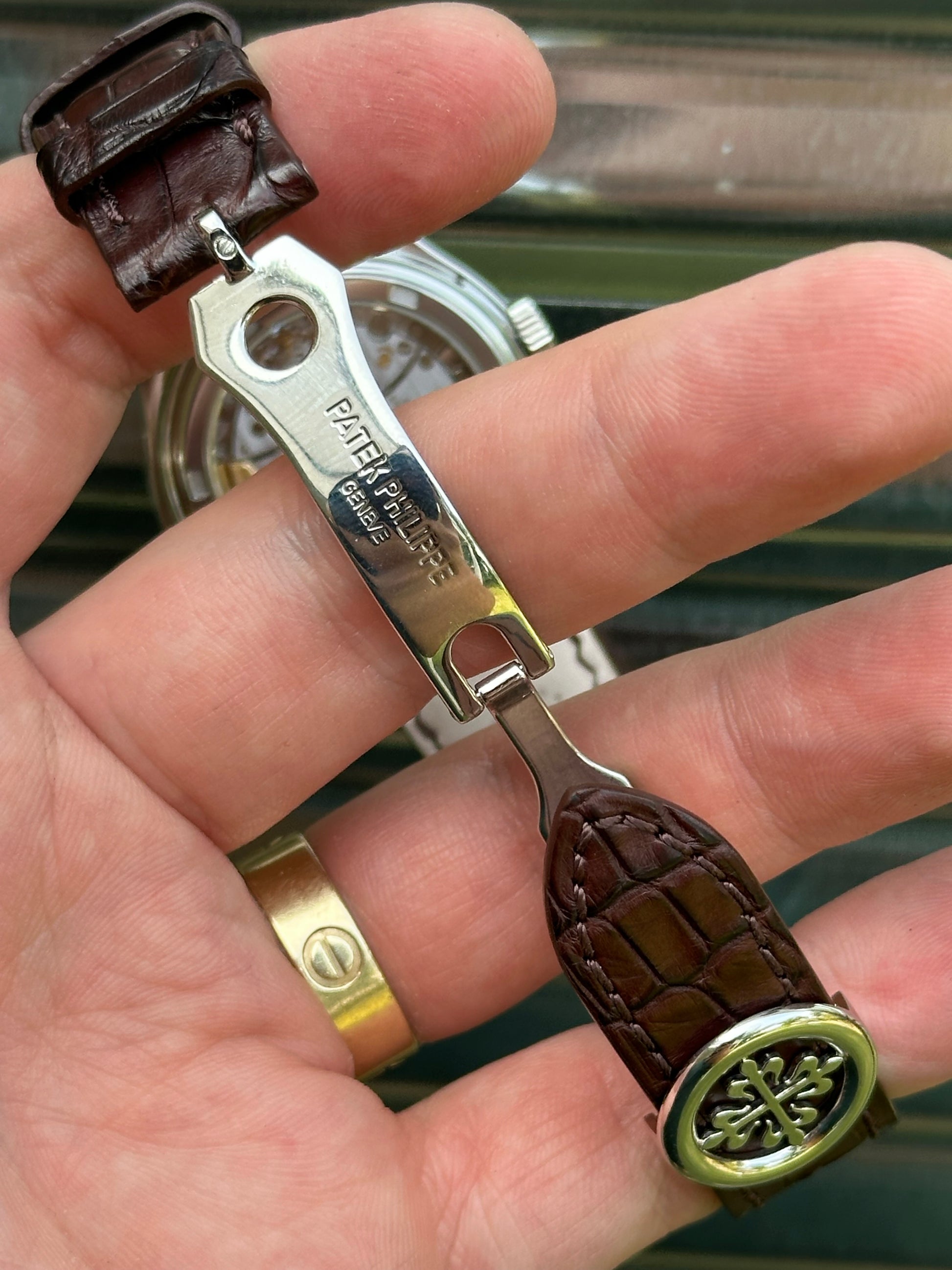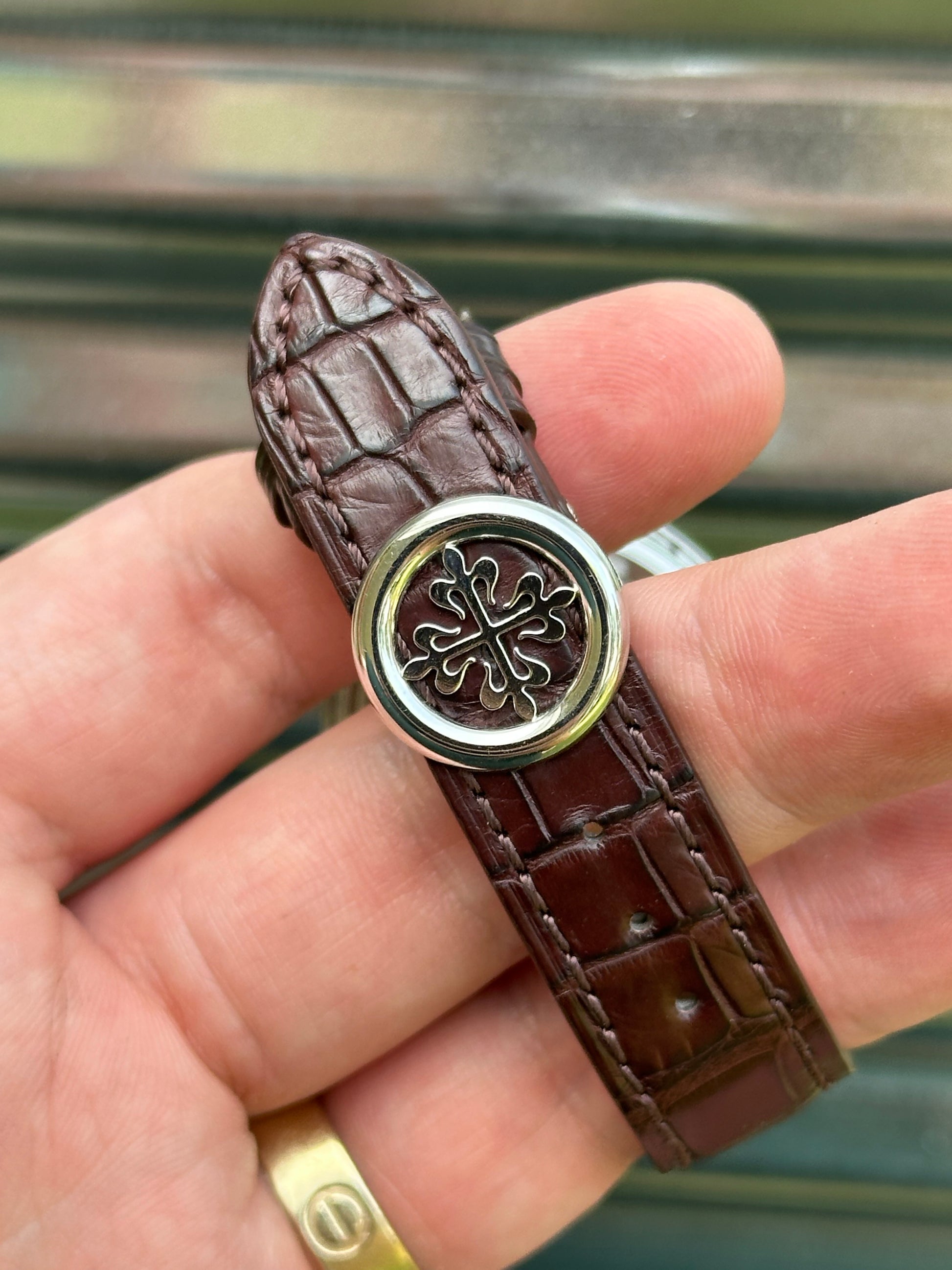 This is powered by PP Calibre 324 automatic winding movement. It comes fitted with a new PP brown alligator strap. The strap will fit a larger wrist. It has the original PP white gold deployant clasp.
