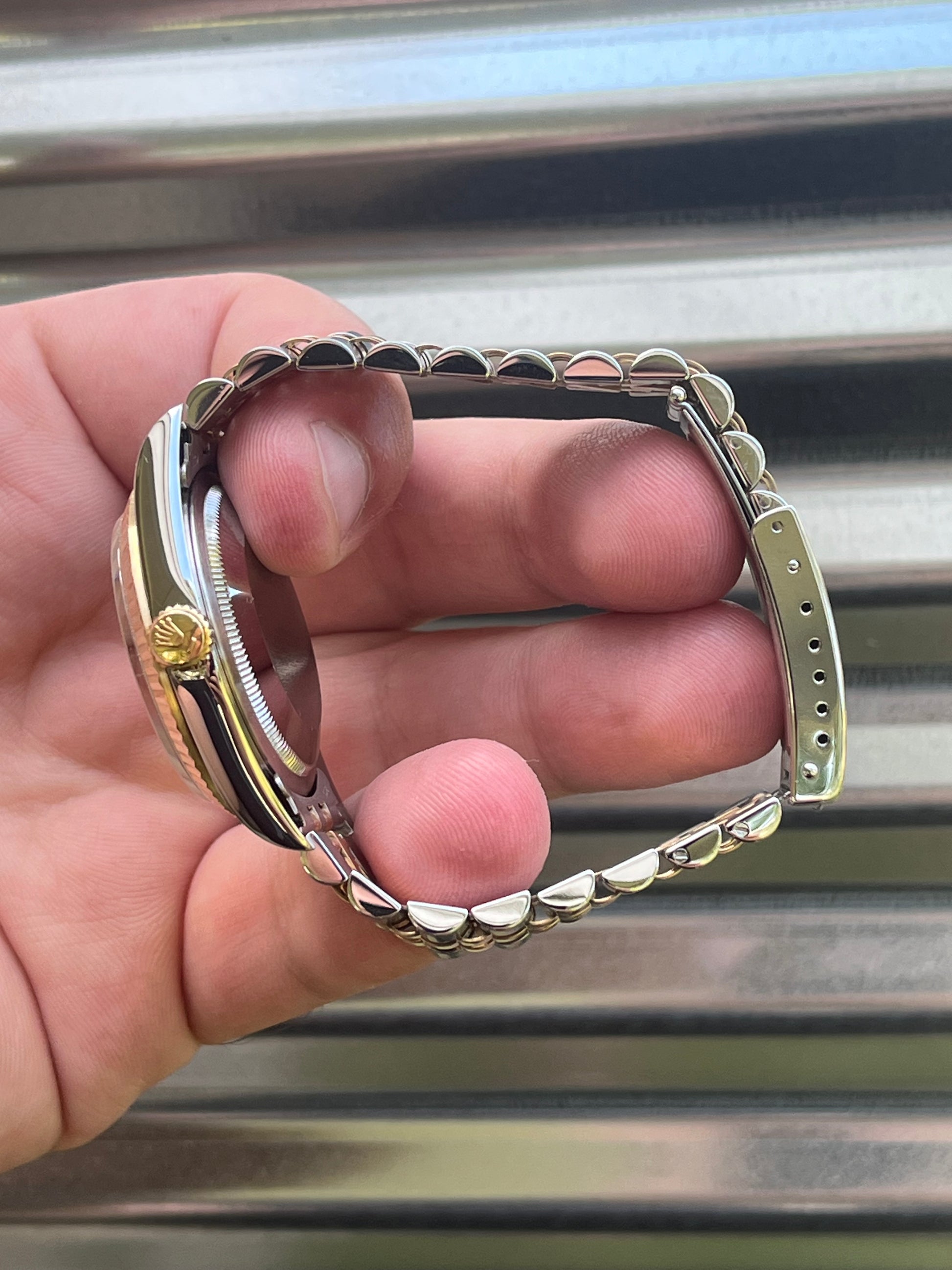 The watch is in overall excellent pre-owned condition - see pics for details. Anniversary dial looks absolutely beautiful and remains in great shape with no corrosion. Case remains in great shape, just take a look at the lugs in the photos! Thick coronet. Quickset movement. Sapphire crystal. Solid no-holes case. Tight bracelet.