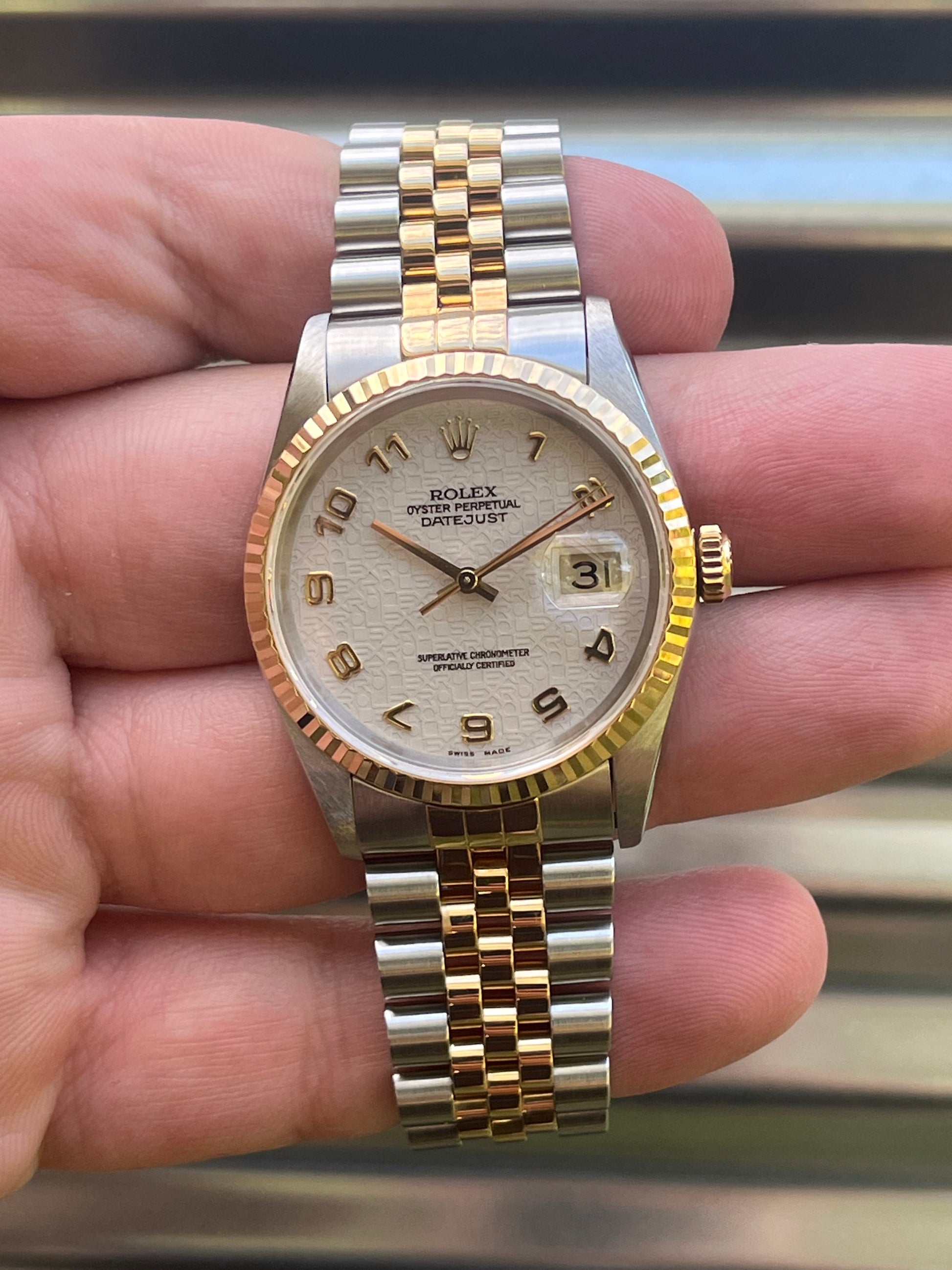 Available is a two-tone Rolex Datejust with a creamy Anniversary Dial reference 16233. This is also known as a jubilee dial. Comes complete with Box & Papers.