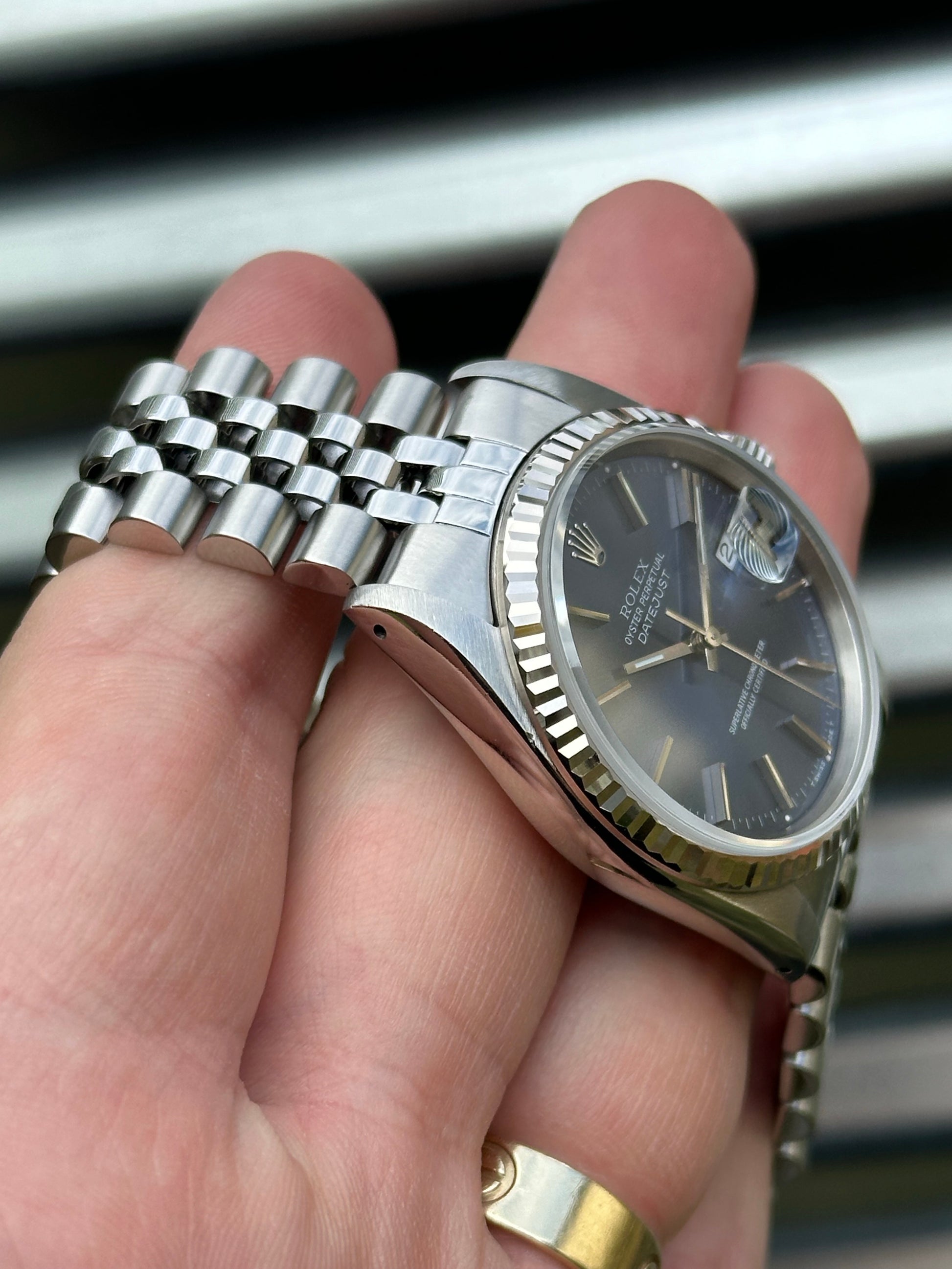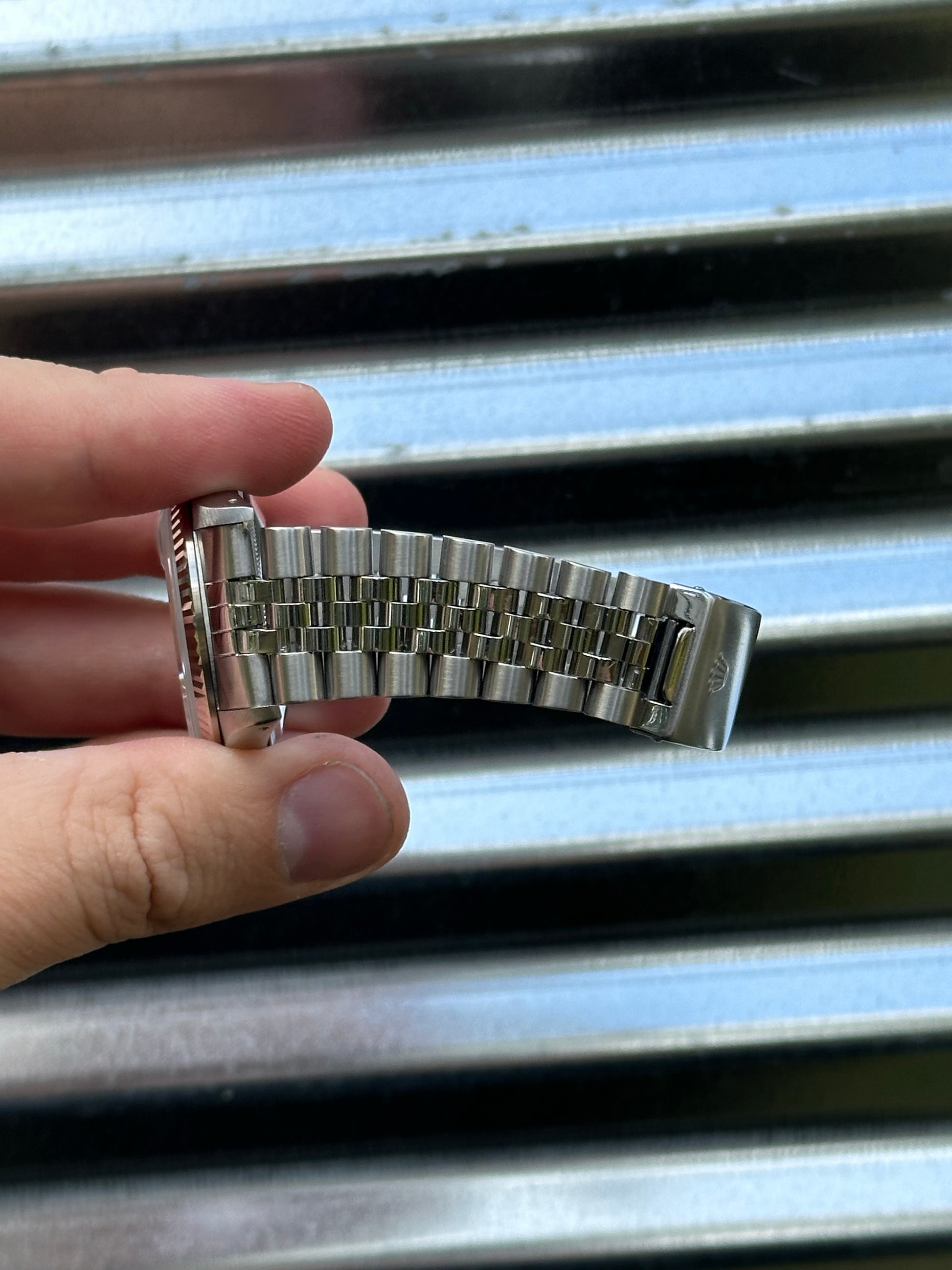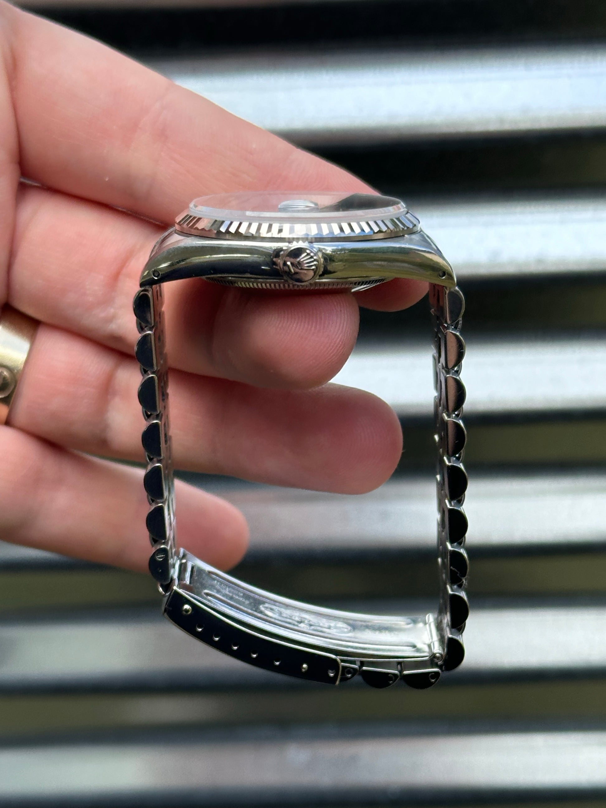 Here is super crispy 16234 Rolex Datejust 36mm with a blue stick dial. One of the best configurations with a jubilee bracelet, and fluted bezel, and at 36mm it’s sleek yet elegant.
