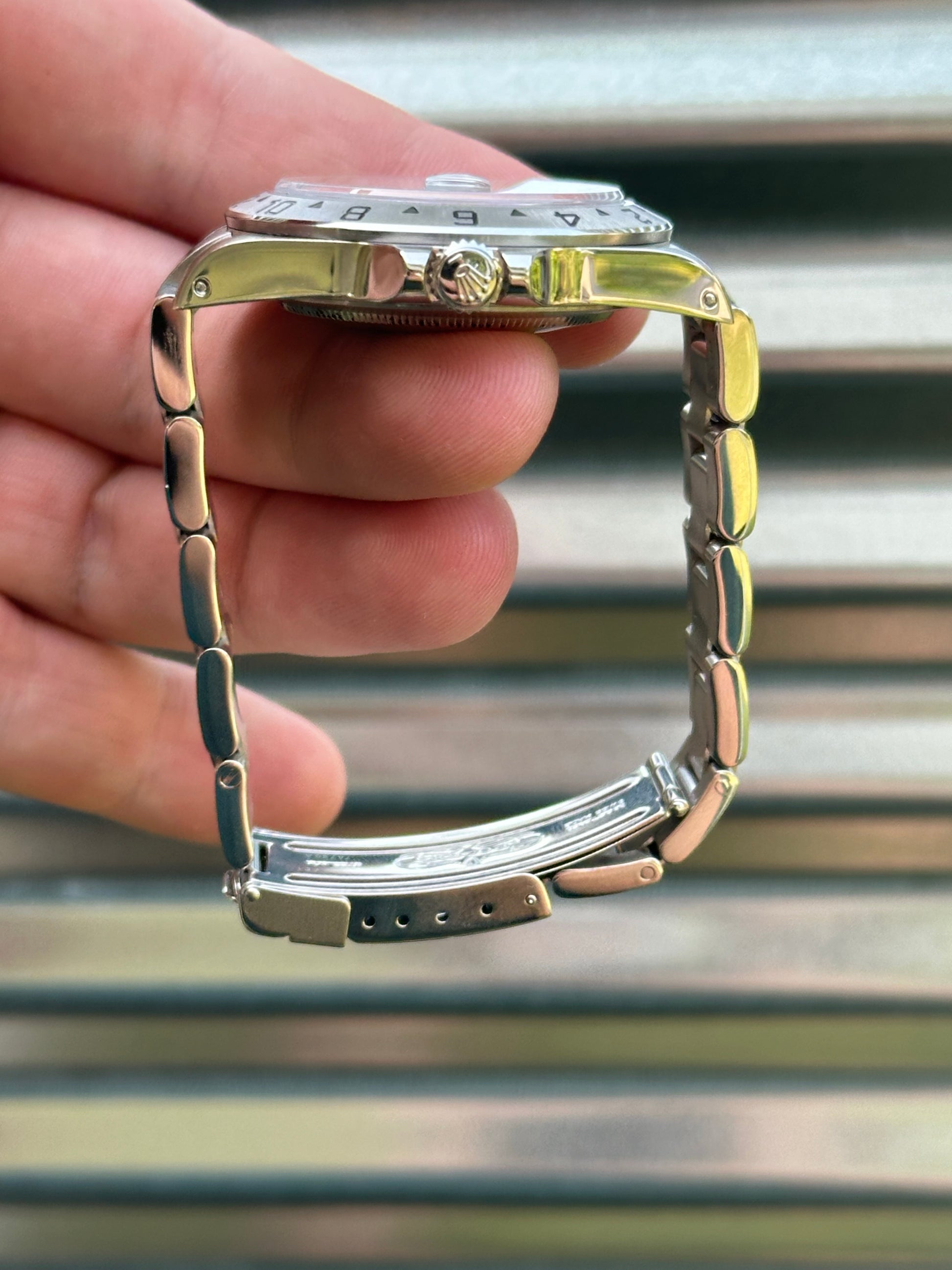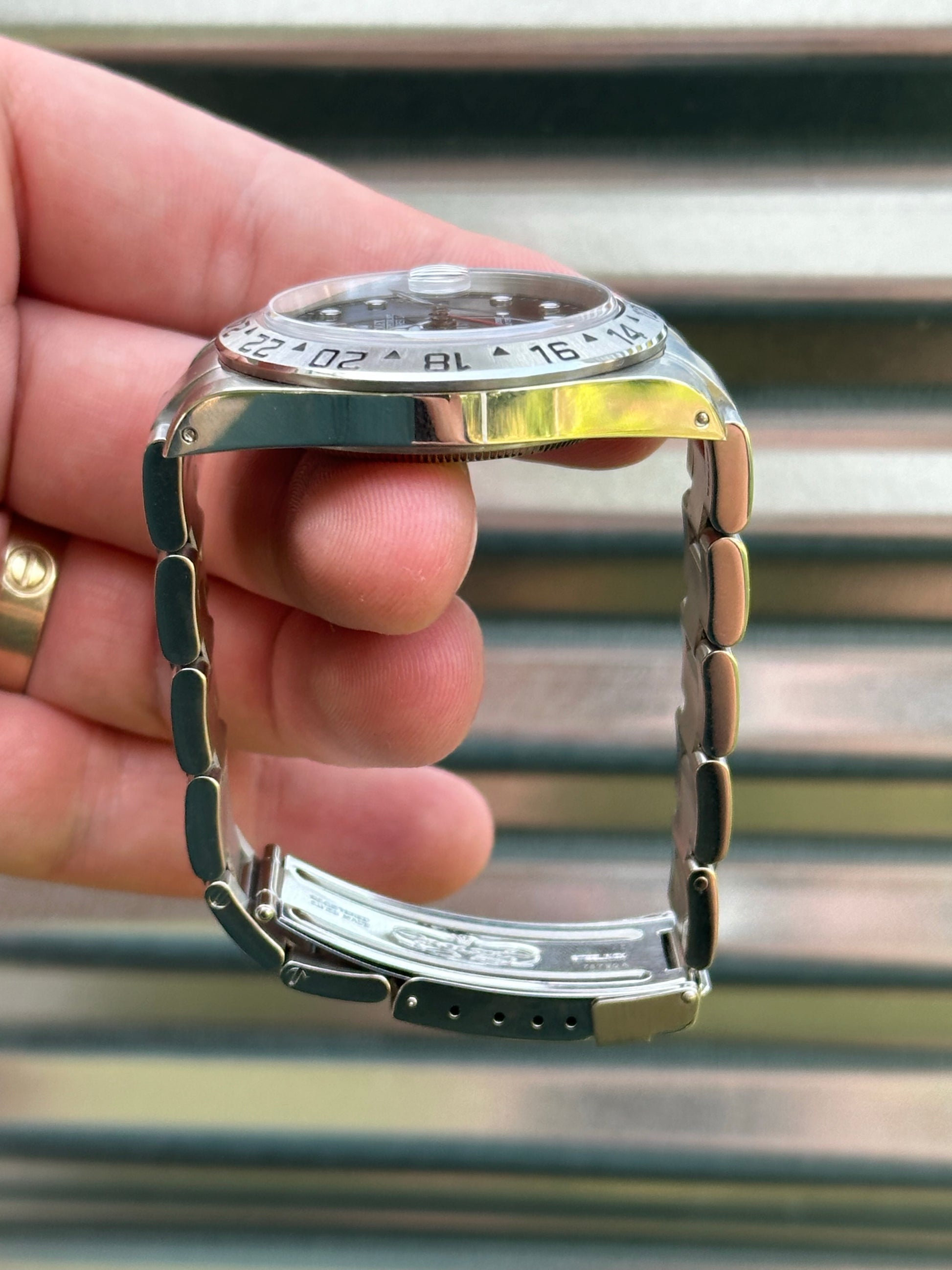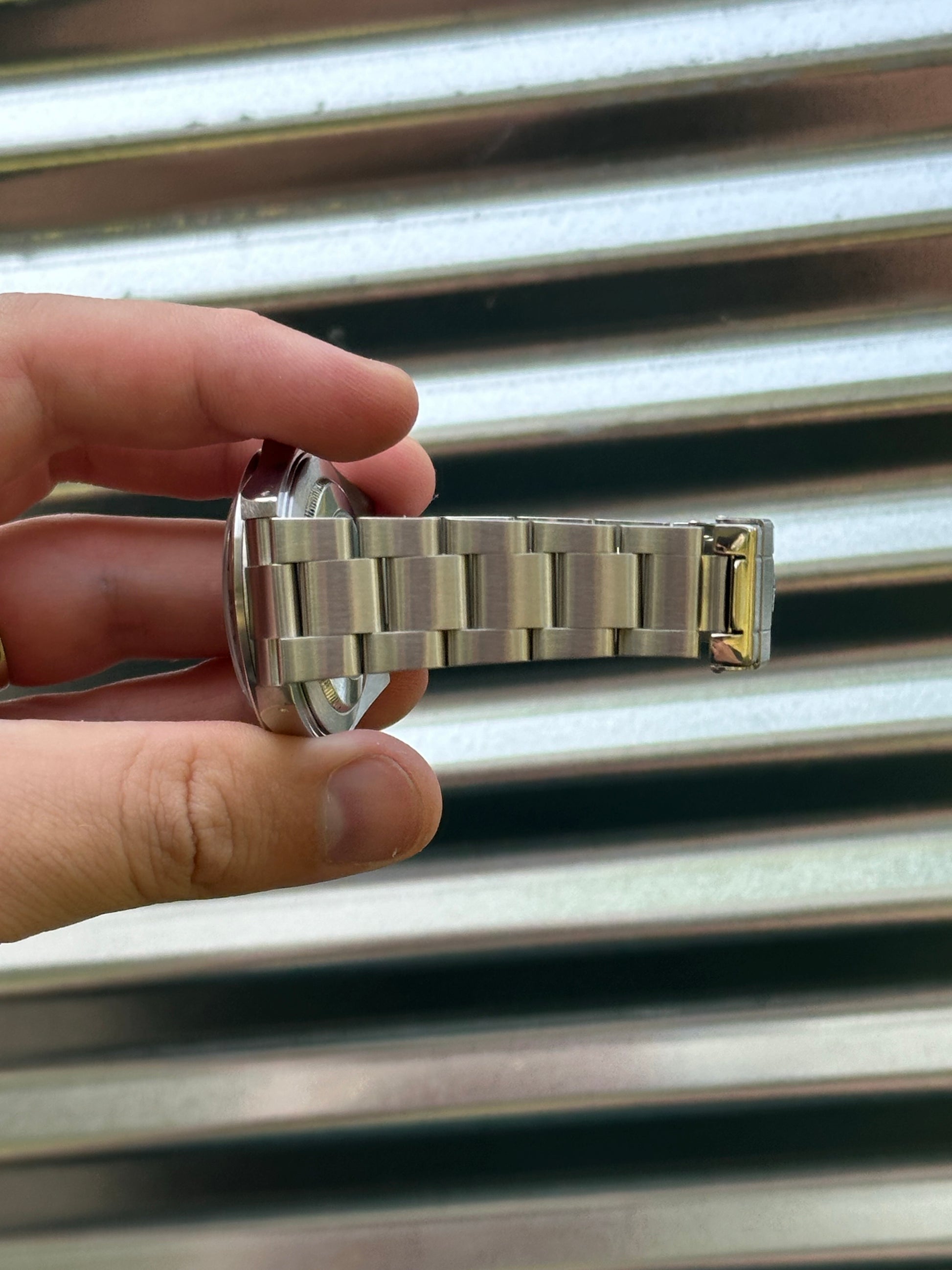The watch is in overall excellent pre-owned condition - see pics for details. Clean dial and hands. No scratches or chips on the crystal. The bezel is crisp. Lettering is full and intact.It features a holes case which makes it easy to remove the bracelet. Thick lugs with really sharp edges.I believe the photos speak for themselves. The bracelet is in excellent shape overall also. Free of any dings. Clean brushed finish on the bracelet and clasp, along with a high polish finish on the side of the links and clasp. Thick coronet on the clasp. Comes with 11 links on the bracelet. Fits about a 7.25” inch wrist.