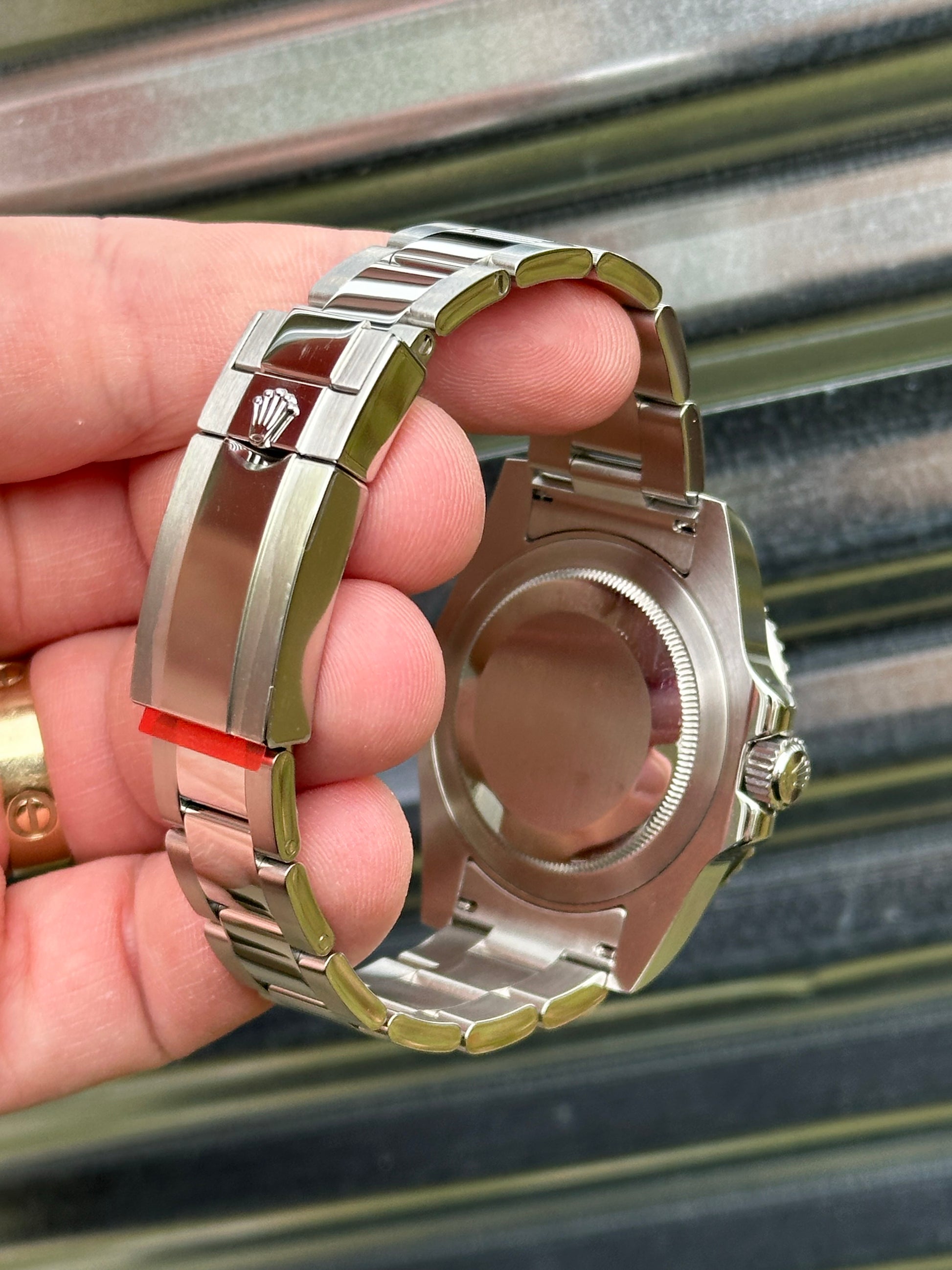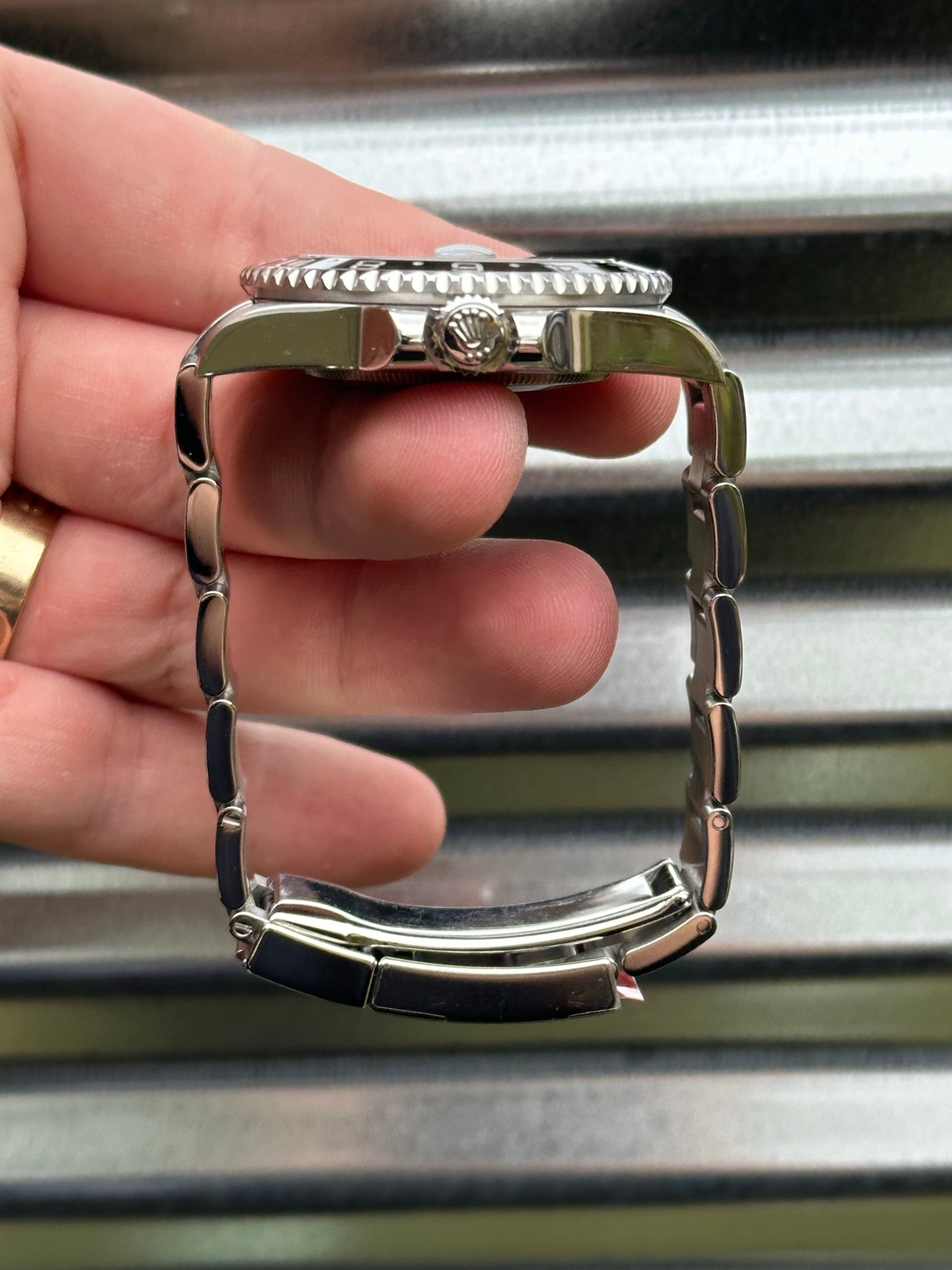 The watch is in overall excellent pre-owned condition - see pics for details. Clean dial and hands. Crystal is clean with no chips. The stainless steel case remains sharp with only minor signs of wear as to be expected for its age. Bezel is clean. Tight bracelet with a clean finish. The coronet is nice and thick on the clasp. Watch remains in great condition! 11 links total. Fits about a 7.5” inch wrist. This configuration of the GMT is very versatile and can be worn with anything.