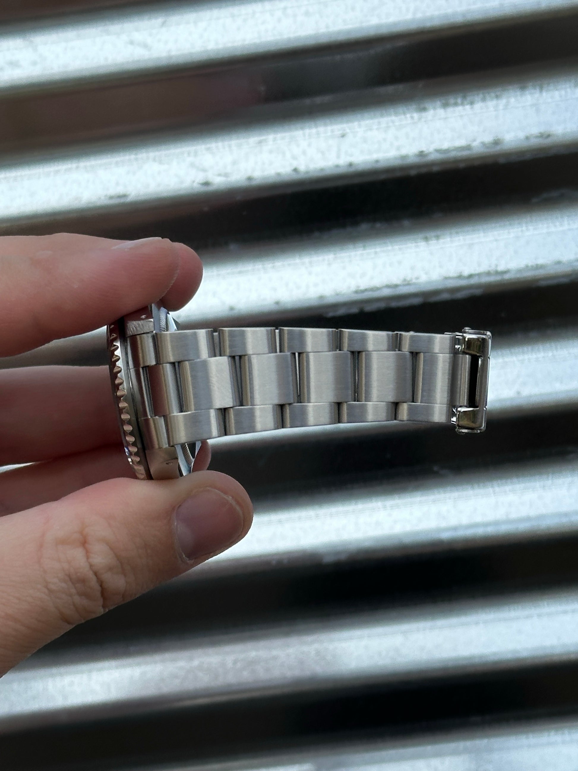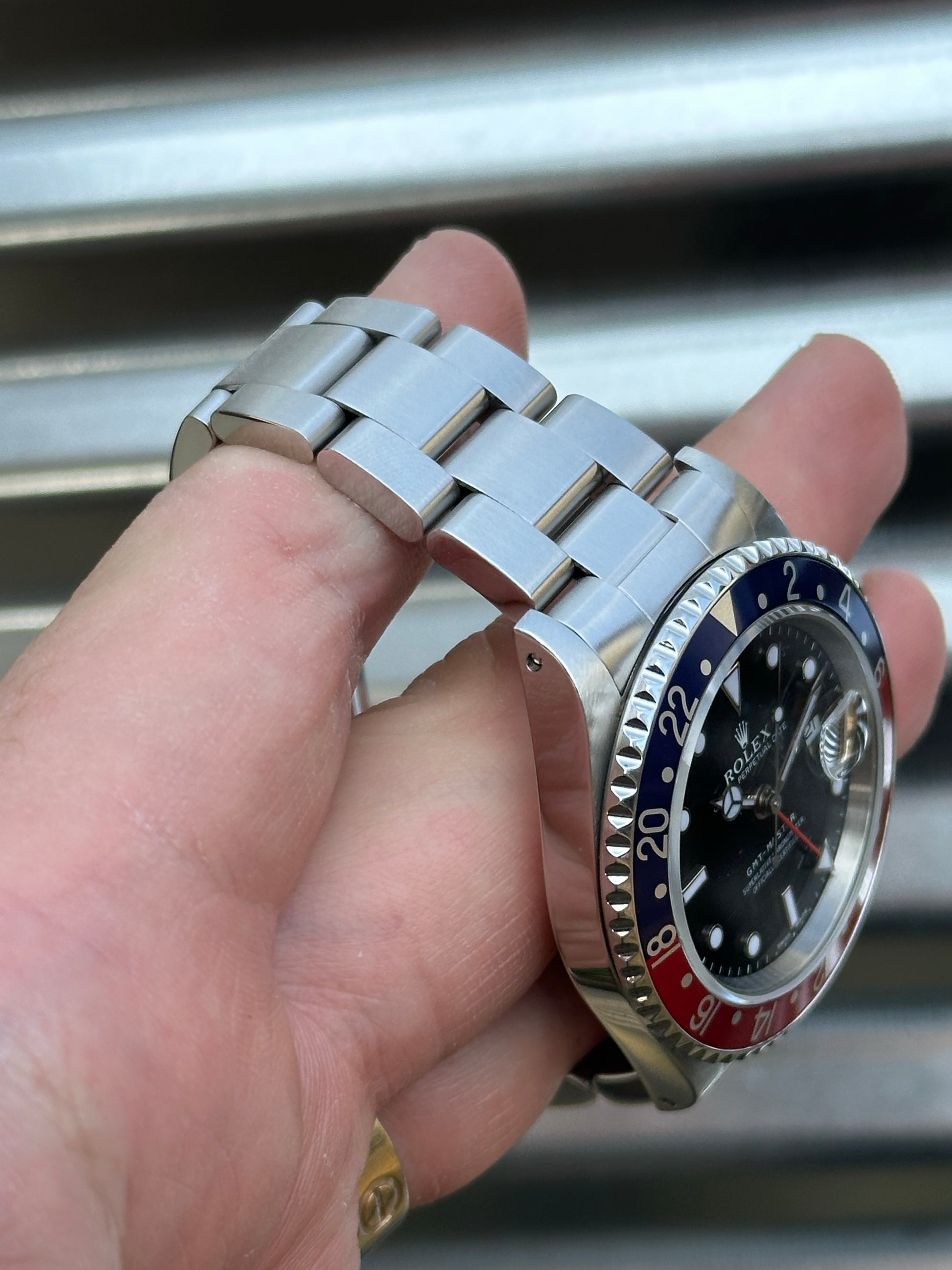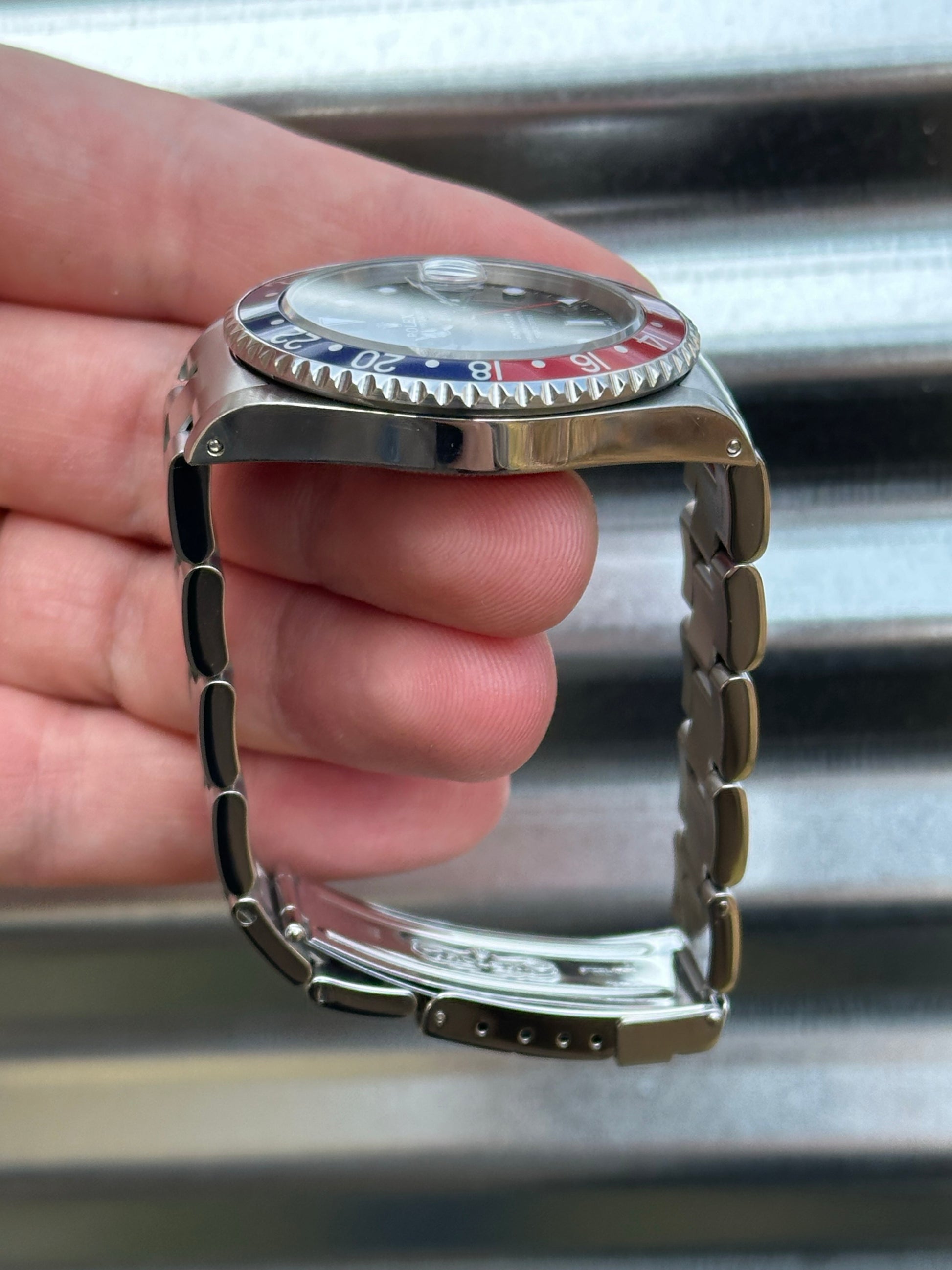 The watch is excellent shape overall. The “Pepsi” bezel is really clean and the colors have aged slightly which gives it a pleasing color. Coming in at 40mm this watch fits the wrist comfortably. Being late 1999, it has a “Swiss Made” dial which still glows nice and bright. The case is in very good shape overall. It has thick lugs with sharp edges. The bracelet is nice and tight. Clean finish on the bracelet and clasp, and the coronet is very defined. 11 links on the bracelet which fits a 7.5 inch wrist. Overall a very clean Pepsi GMT.