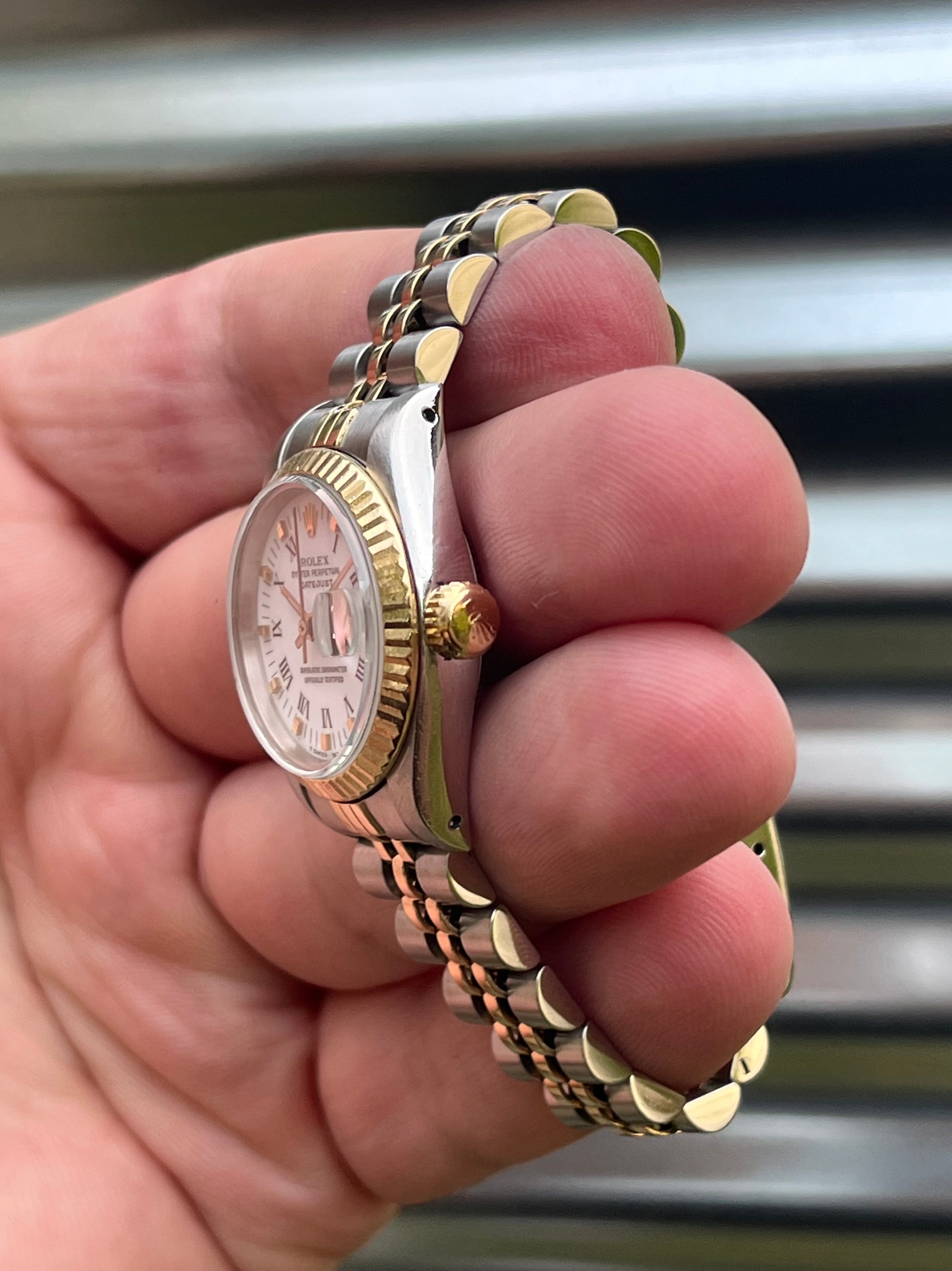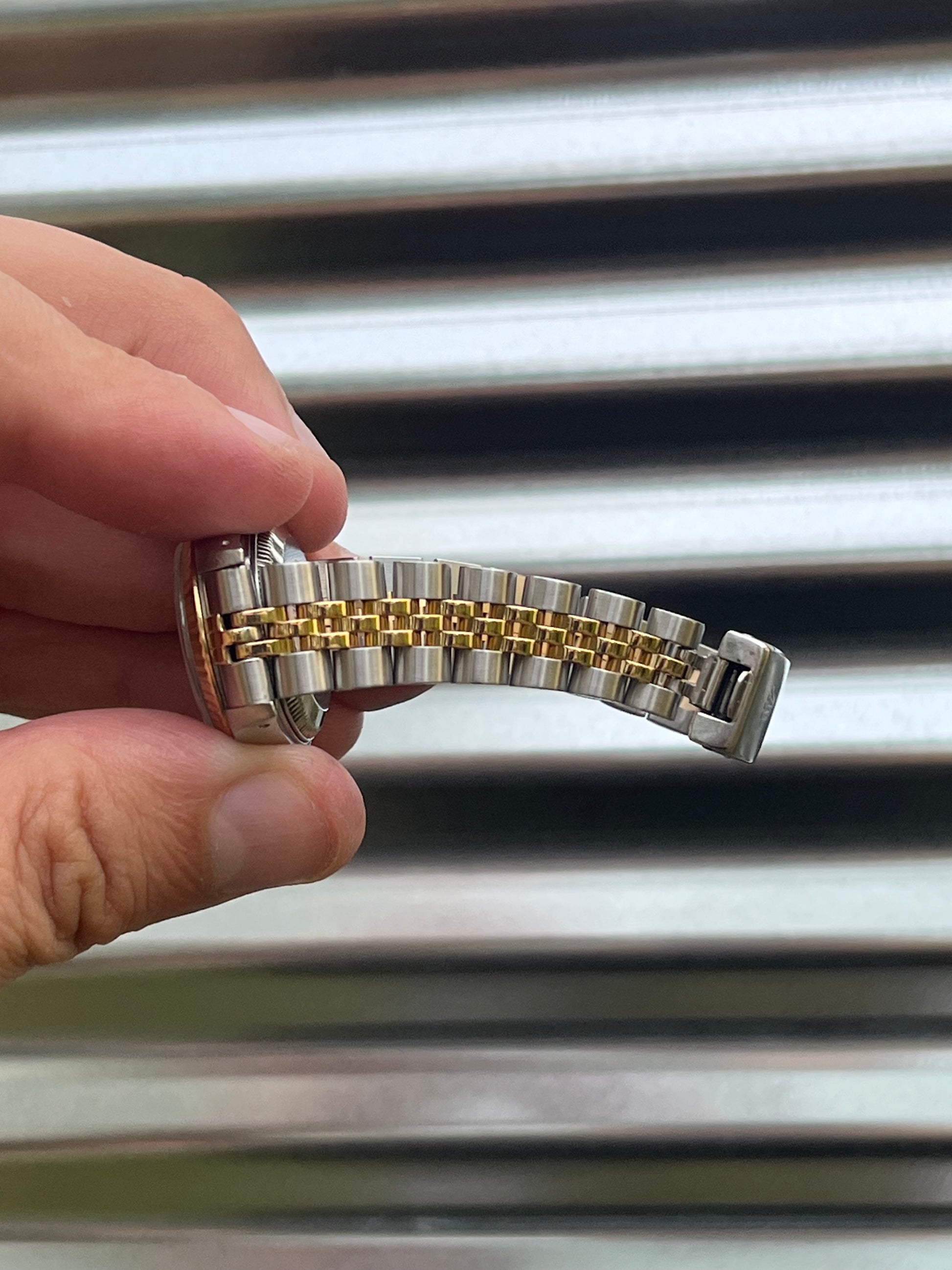 Overall this watch is in very good pre-owned condition. The white roman-numeral dial and hands are clean. Case geometry is intact with thick lugs. High polish surface on the side of the case is clean. No major dings or scratches. The 18k gold fluted bezel well defined and free of dings as well. Clean finish on the links. Gold center links are nice and shiny.