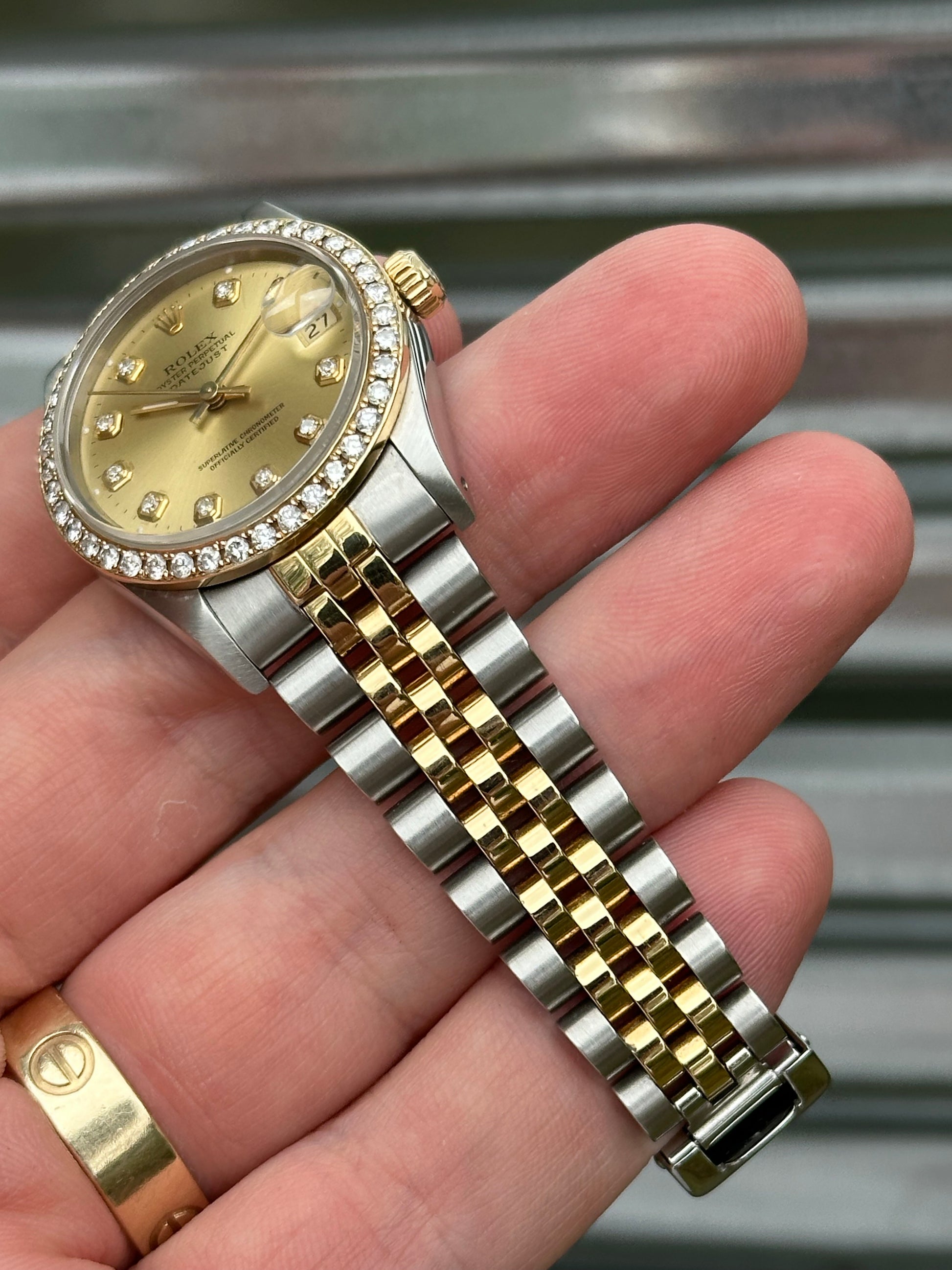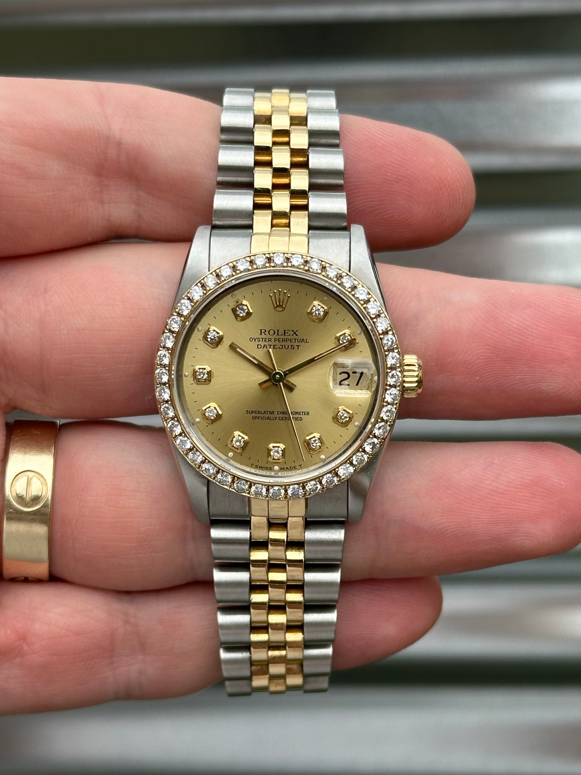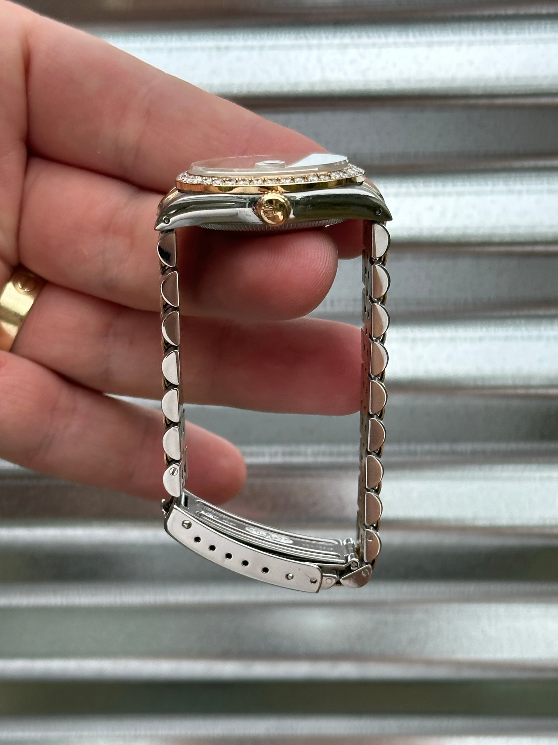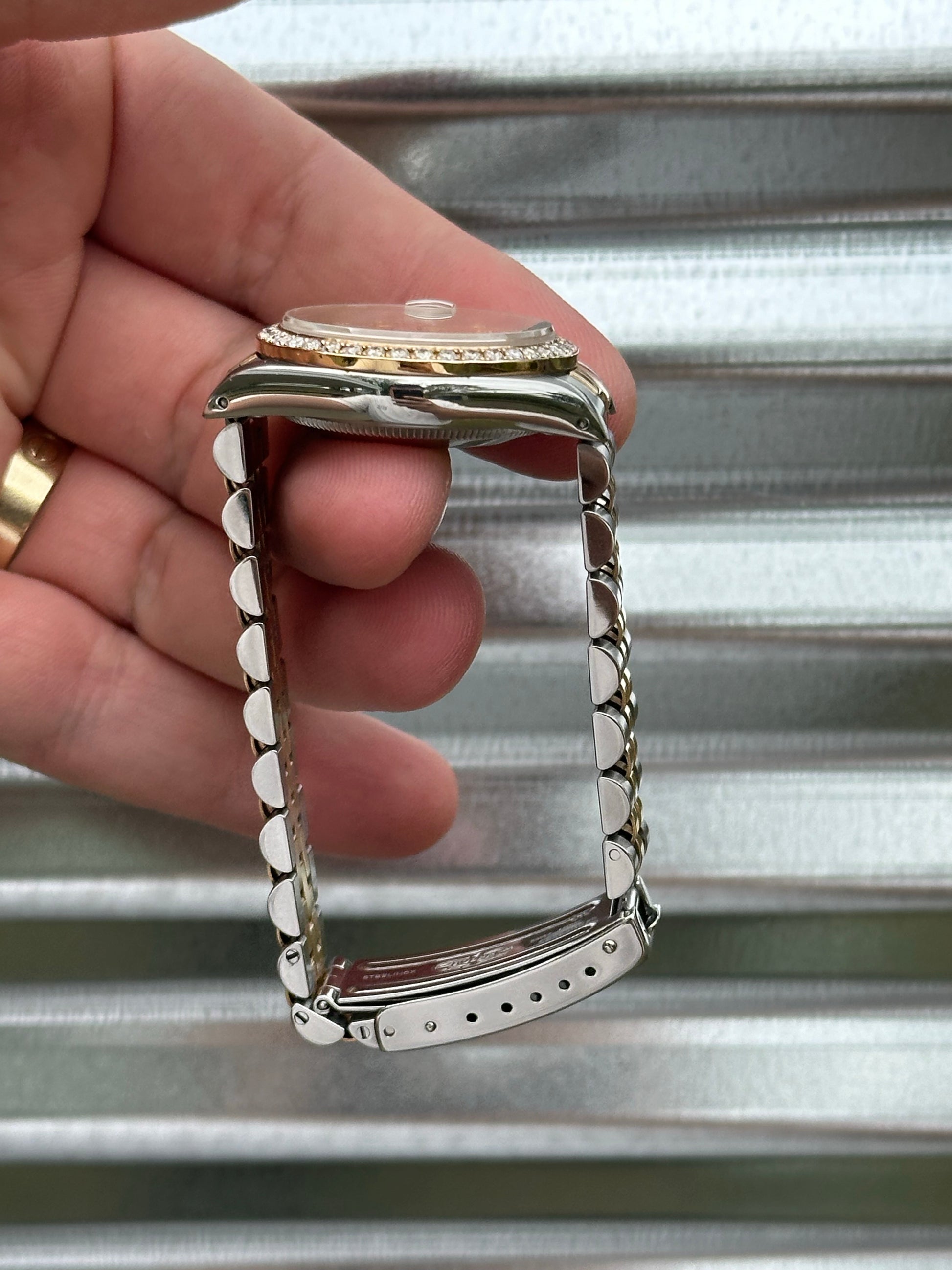 Overall this watch is in very good pre-owned condition. The champagne diamond dial is clean. Sharp case with nice edges, thick lugs, and clean high polish surface on the sides. Holes case. The aftermarket diamond bezel matches well with the diamond dial. Bracelet remains pretty tight. Clean finish on the links. There are 18 links total on the bracelet. Winds smoothly. Overall, a really nice watch that remains in great condition. It would make for a great gift to a loved one!